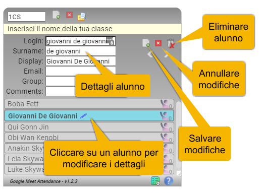 Una volta creati, gli elenchi classe con i rispettivi alunni saranno sempre disponibili, verranno memorizzati nel database dell’estensione, e perfino sincronizzati tra più dispositivi, se avremo attivato la sincronizzazione dell’utente Google Suite in Chrome.