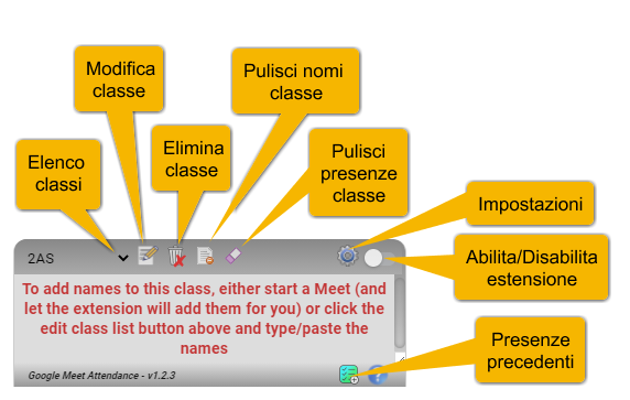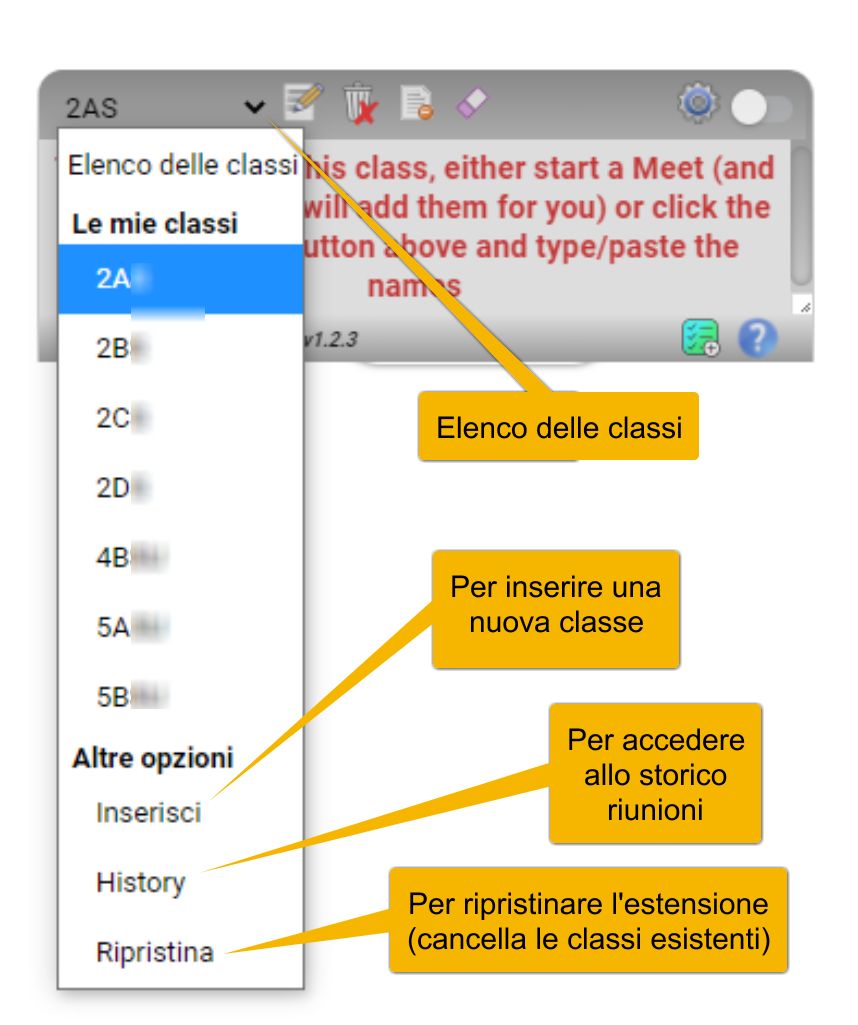 Nell’immagine sopra vengono mostrate le funzioni disponibili nell’interfaccia principale di Google Meet Attendance (GMA). Prima di tutto è necessario inserire le nostre classi, mediante il menù a tendina “Elenco classi”.