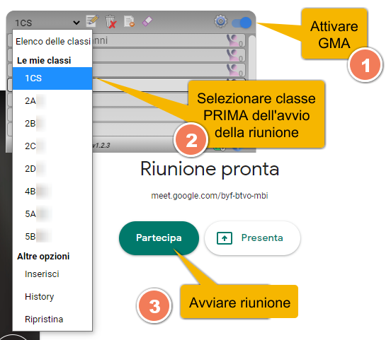 Ad ogni buon conto, non consiglio di inserire l’elenco alunni in maniera preventiva, ma solo di creare l’elenco delle classi, lasciandole vuote. L’estensione infatti è in grado di popolare automaticamente l’elenco degli alunni ogni volta che si avvia una riunione video con la classe. La migliore strategia a mio avviso è quella di effettuare un primo meeting con ogni classe e lasciare che GMA crei automaticamente l’elenco con i nominativi degli studenti che si collegano.
