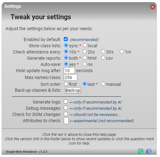 - “Check attendance every” possiamo impostare l’intervallo nel quale l’estensione deve controllare la presenza degli alunni, ogni 10, 20, 30 secondi o ogni minuto.