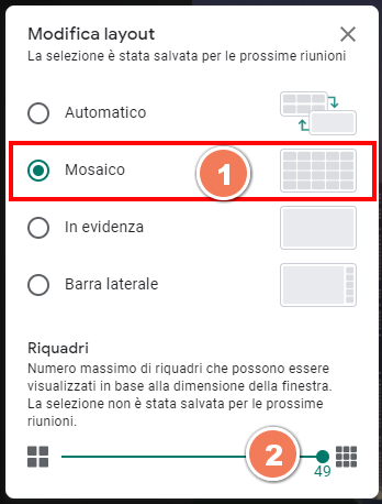 Successivamente bisogna selezionare il layout a “Mosaico” e impostare il numero di riquadri al massimo possibile, affinché tutti gli utenti connessi vengano visualizzati costantemente durante la riunione.