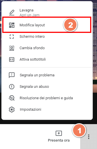 IMPORTANTE – Subito dopo aver avviato la riunione, bisogna impostare il layout in Mosaico, cliccando sui 3 puntini in basso a destra nella barra operativa e scegliendo l’opzione “Modifica layout”.