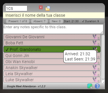 Nella barra superiore della finestra fluttuante dell’elenco, visualizzeremo le statistiche della riunione con n. presenti, assenti, nuovi alunni, orario di inizio e durata della riunione. Passando con il mouse su un singolo studente è possibile vedere a che ora è entrato e l’ultimo orario di permanenza.