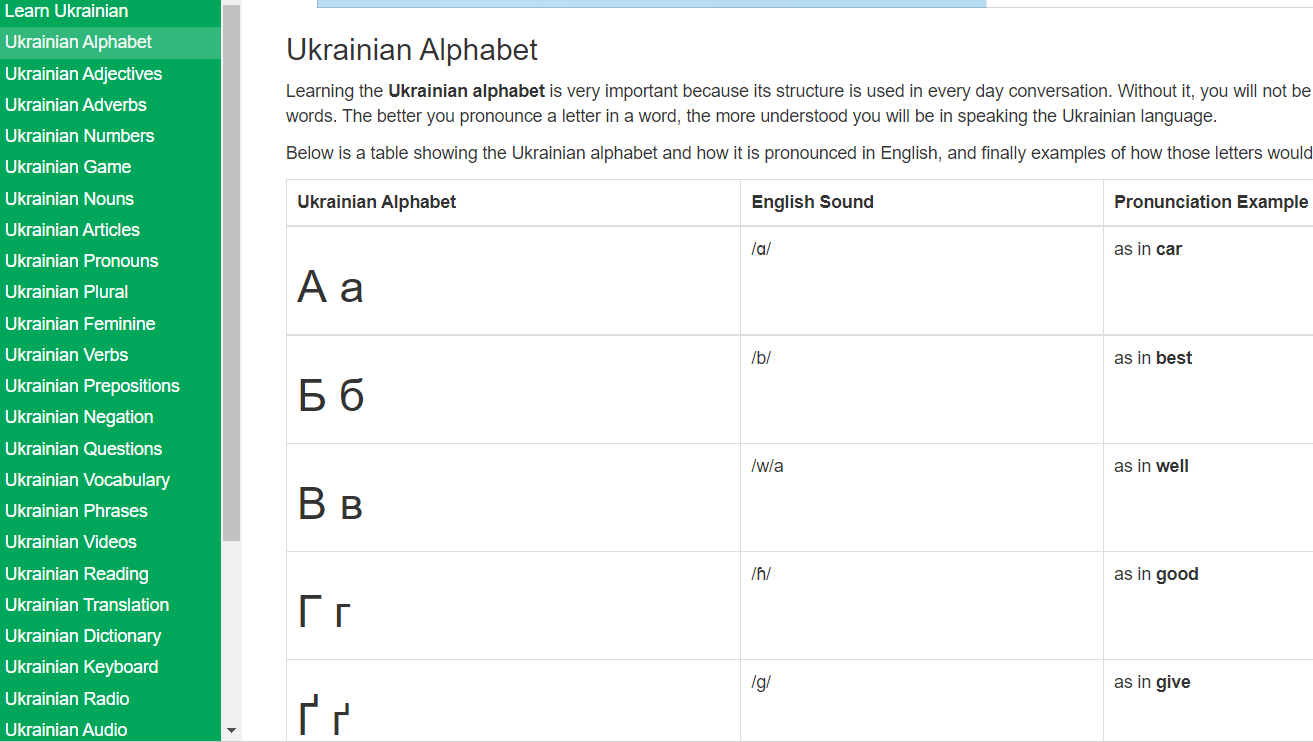 La pagina dedicata alla lingua ucraina  è incentrata su aggettivi, avverbi, articoli, genere (femminile, maschile…), negazione, nomi, numeri, frasi, plurale, preposizioni, pronomi, domande, verbi, vocabolario, esercizi e vere e proprie lezioni.
