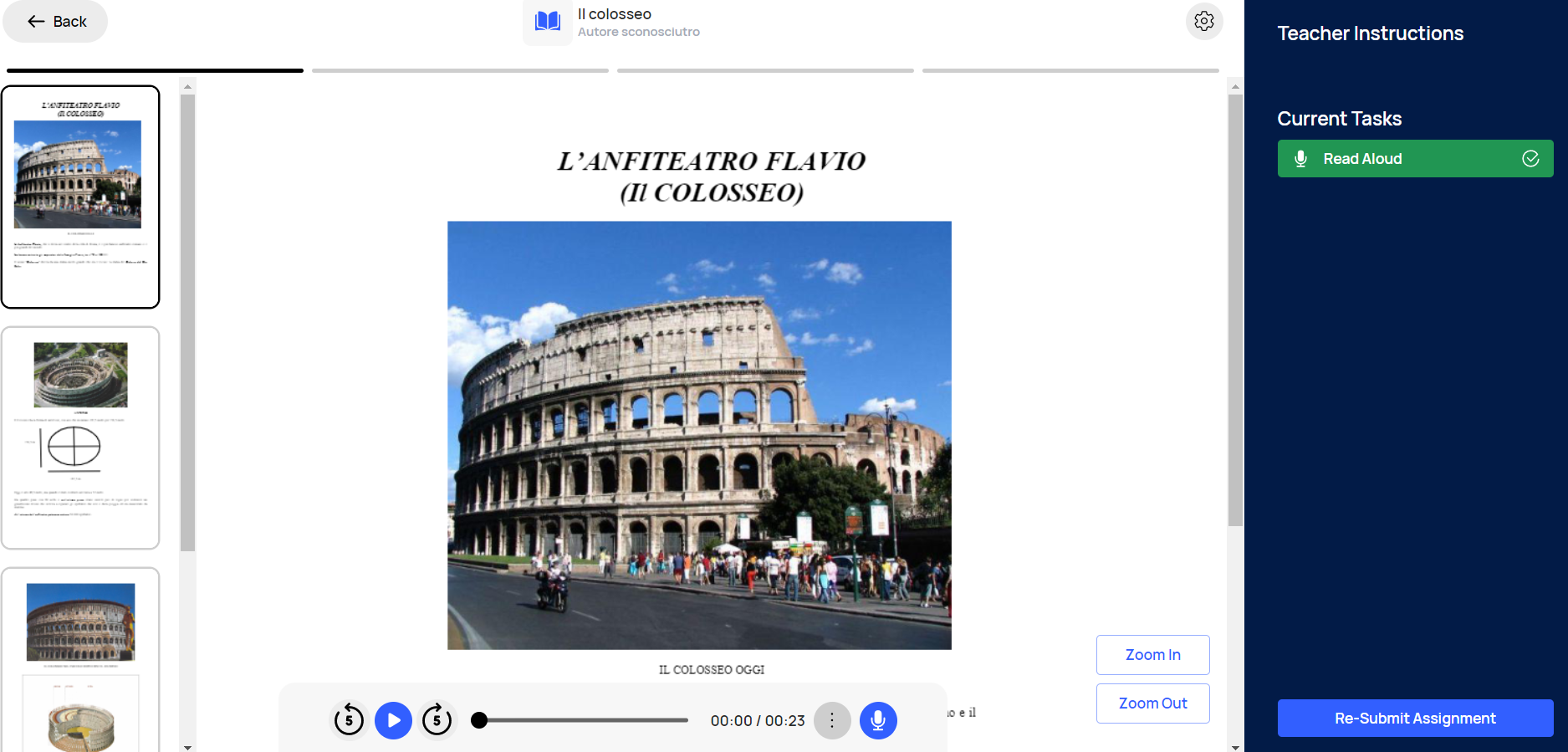In pratica, voi copiate un testo o caricate un file in piattaforma, assegnando come compito la lettura dello stesso. Gli studenti attivano il microfono e leggono il testo e la piattaforma utilizza l’Intelligenza Artificiale per analizzare come gli alunni leggono il compito. Tale analisi vi viene fornita in un breve rapporto visualizzato accanto a tutti i compiti inviati dai vostri alunni (registrazioni comprese).