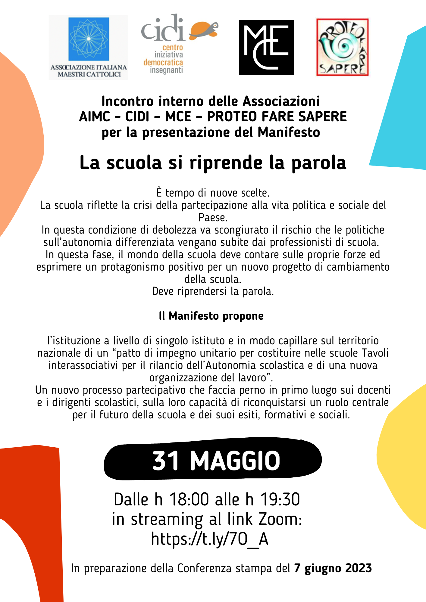 Il 31 maggio dalle ore 18:00 alle ore 19:30 è previsto un incontro interno delle Associazioni AIMC, CIDI, MCE e Proteo Fare Sapere per la presentazione del Manifesto “La scuola si riprende la parola”.
