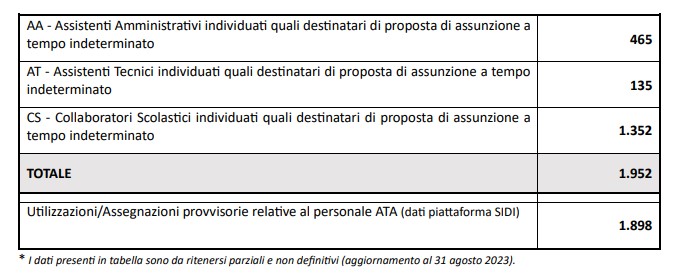 Per quanto riguarda, invece, il personale ATA, l’USR Lombardia rende noto che ‘all’esito delle operazioni di reclutamento del personale ATA per l’a.s. 2023/2024, avviate a livello regionale – anche in applicazione del DM 150 del 28 luglio 2023 recante “Disposizioni concernenti le immissioni in ruolo del personale amministrativo, tecnico e ausiliario (A.T.A.) per l’anno scolastico 2023/2024” – e, successivamente, gestite a livello provinciale, questo Ufficio fornisce la seguente tabella riepilogativa’: