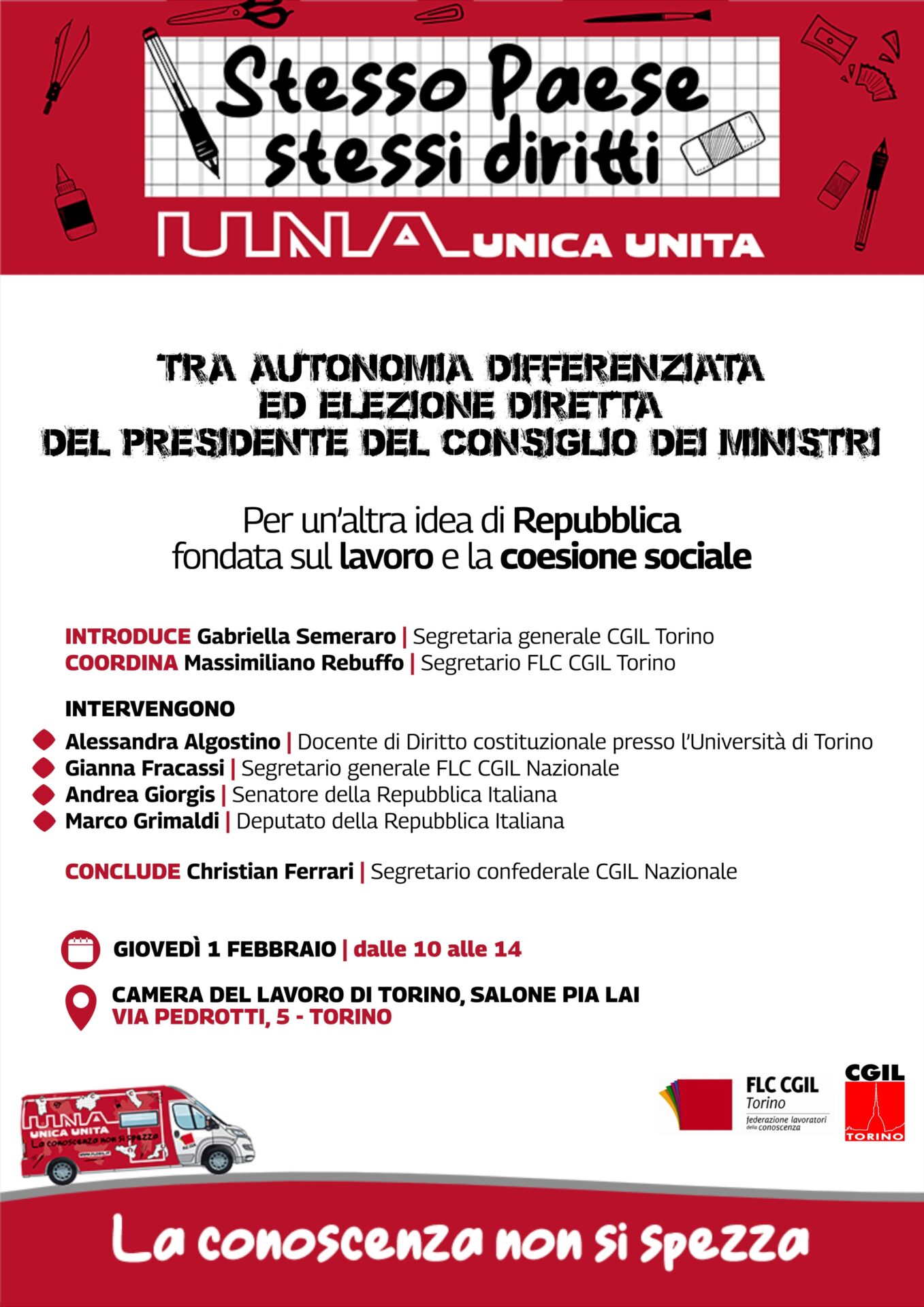Il segretario confederale della CGIL Christian Ferrari concluderà l’iniziativa promossa dalla CGIL e dalla FLC CGIL di Torino “Tra autonomia differenziata ed elezione diretta del Presidente del Consiglio dei Ministri”.