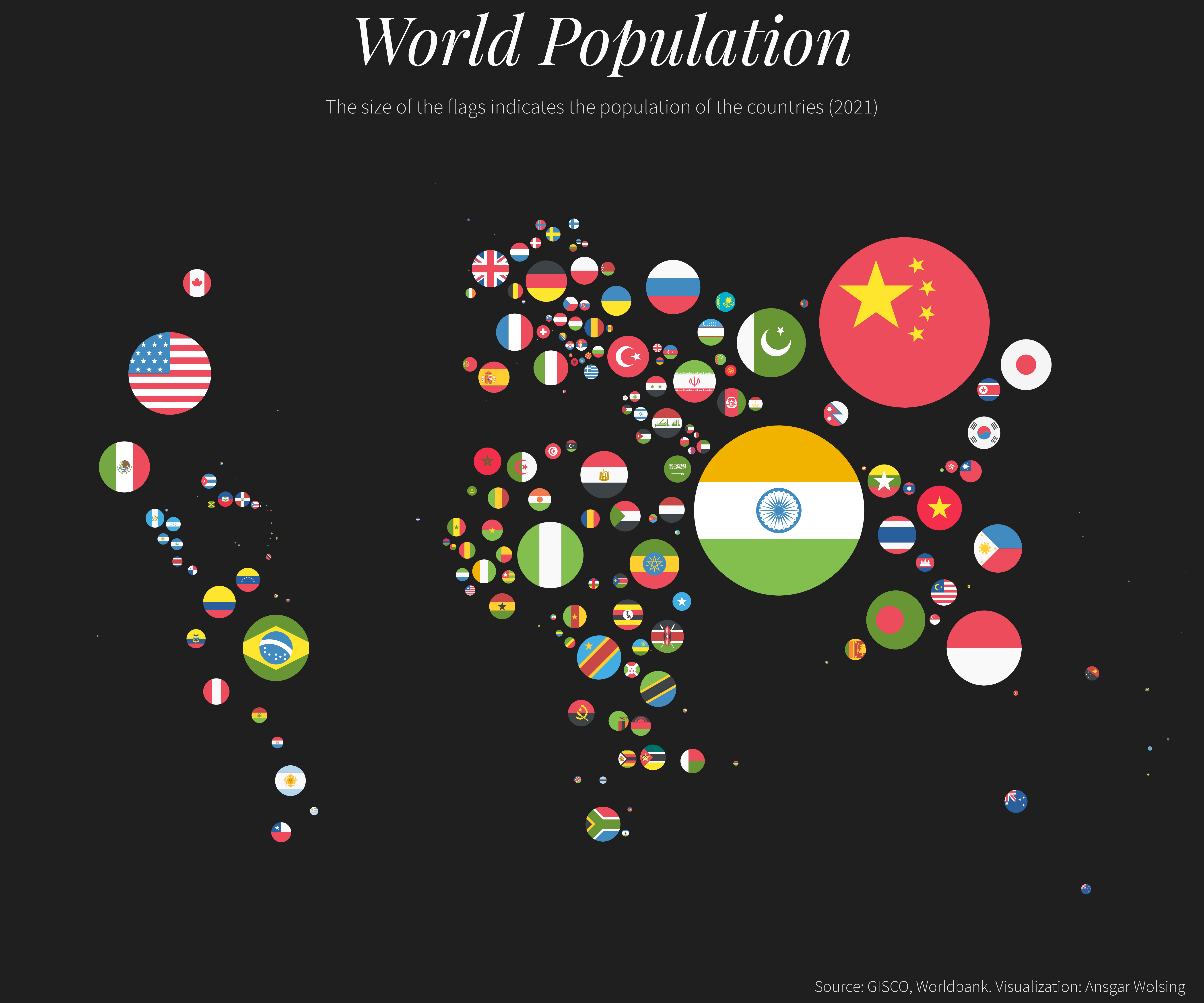 Questo cartogramma utilizza le bandiere circolari di ogni Paese per rappresentare la densità di popolazione, con dei simboli una dimensione proporzionale a questo dato.