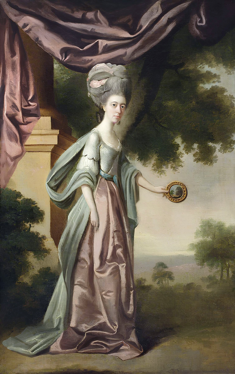 Edward Alcock (attr.), Sophia Anne Delaval tiene uno specchio Claude verso il paesaggio, 1775-1778