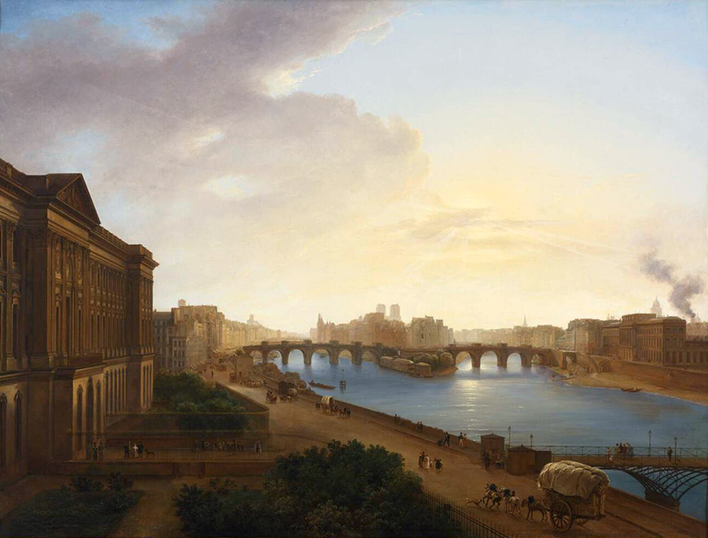 Allo stesso anno appartiene anche una suggestiva Veduta di Parigi dal Louvre con il sole che sorge dietro il Pont Neuf e l’Île de la Cité. Da notare l’effetto dei raggi di sole che fuoriescono da alcune nubi che richiamano certe scenografiche albe di Claude Lorrain.