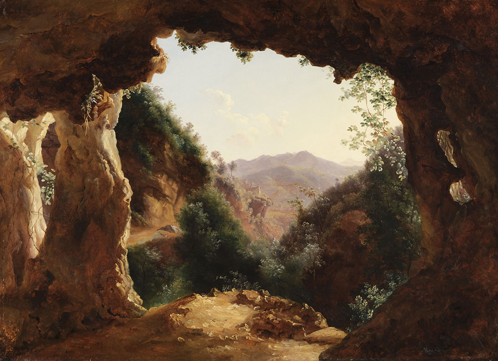Inoltre, a differenza dei primi pittori en plein air, vendette sia i paesaggi finiti sia gli studi a olio, anche se questi furono probabilmente ritoccati in studio. È il caso, per esempio, di questa veduta dipinta dall’interno di una grotta, iniziata sul posto e completata con alcune aggiunte successive, come la vegetazione pendente. La scelta di collocare l’osservatore all’interno della grotta crea un effetto-finestra che incornicia la vista sulle montagne lontane.