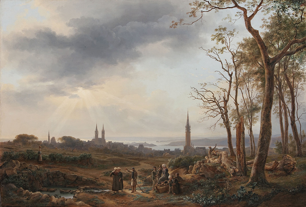 Simili raggi luminosi si trovano anche nella Vista di Saint-Pol-de-Léon, città della Bretagna che la pittrice raffigurò nel 1837. Qui torna la tipica nitidezza dei paesaggi classici, con l’albero in primo piano sul bordo della tela e un dettagliato skyline del centro abitato sullo sfondo. Ma la dolcezza del cielo nuvoloso ammanta la scena di un palpitante senso di armonia con la natura.