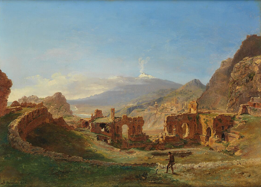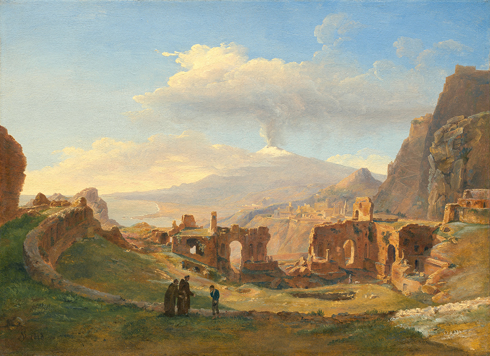 La stessa fusione tra classicità e paesaggio viene ritrovata dalla pittrice in Sicilia, terra che attraversò in lungo e in largo, e in particolare presso il teatro greco-romano di Taormina. Quella veduta, con la cavea ricoperta d’erba e il vulcano che svetta sopra la scenae frons, era talmente attraente che Sarazin de Belmont la raffigurò due volte, nel 1825 e nel 1828.