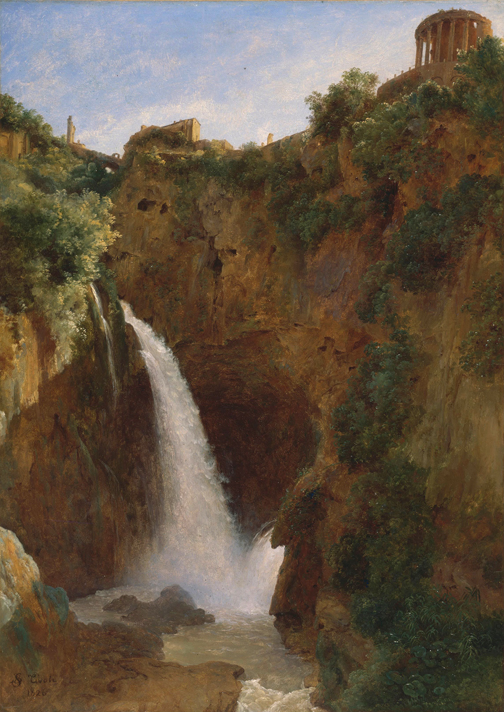 Tra le prime opere italiane alcune vedute imperdibili per artisti e viaggiatori del Grand Tour, come la cascate di Tivoli, dipinte nel 1826. La maestosa visione è colta dal basso, dalla valle dell’Inferno, e include in alto a destra anche il Tempio di Vesta. Si tratta di un tipico paesaggio romantico, che unisce storia e natura in un insieme allo stesso tempo sublime e pittoresco.