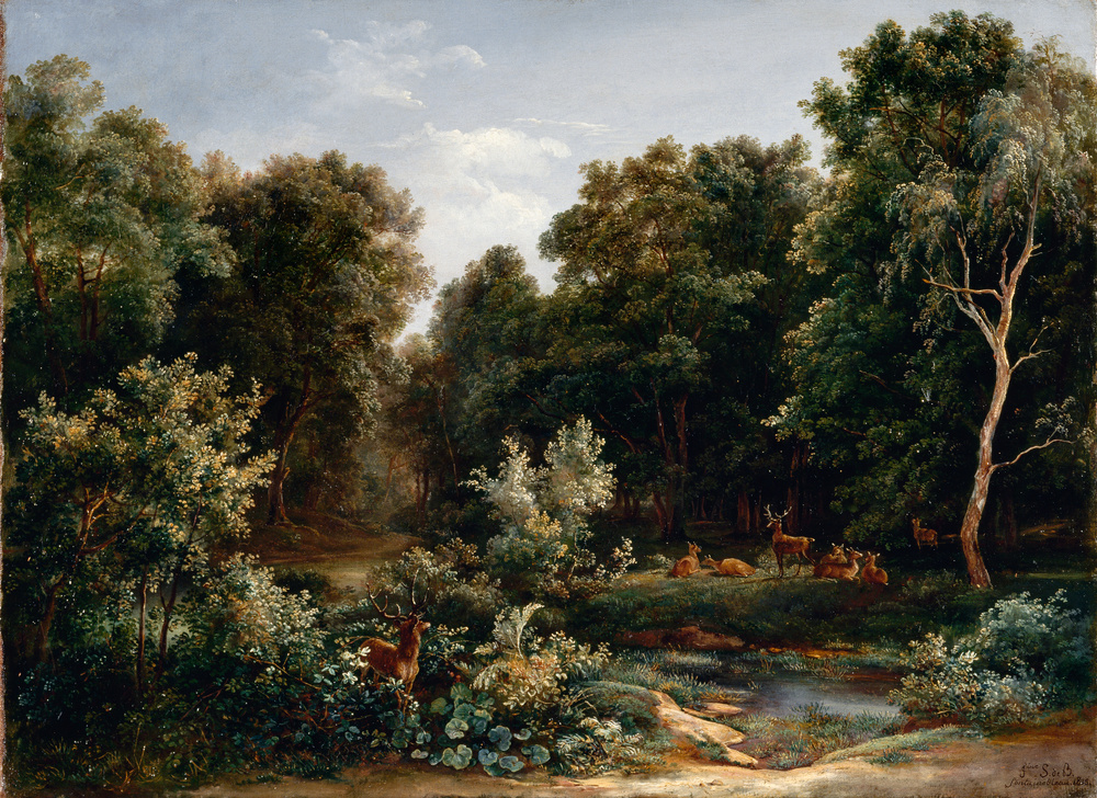 Nel 1833 raffigurò anche la foresta di Fontainebleau, luogo dove si stava formando la Scuola di Barbizon. A differenza degli studi di piccolo formato, realizzati con pennellate sciolte e un vivido effetto di naturalezza, questa tela mostra un linguaggio più accademico e la tentazione di fare di quel luogo una veduta ideale, che tendono a irrigidire leggermente la scena.
