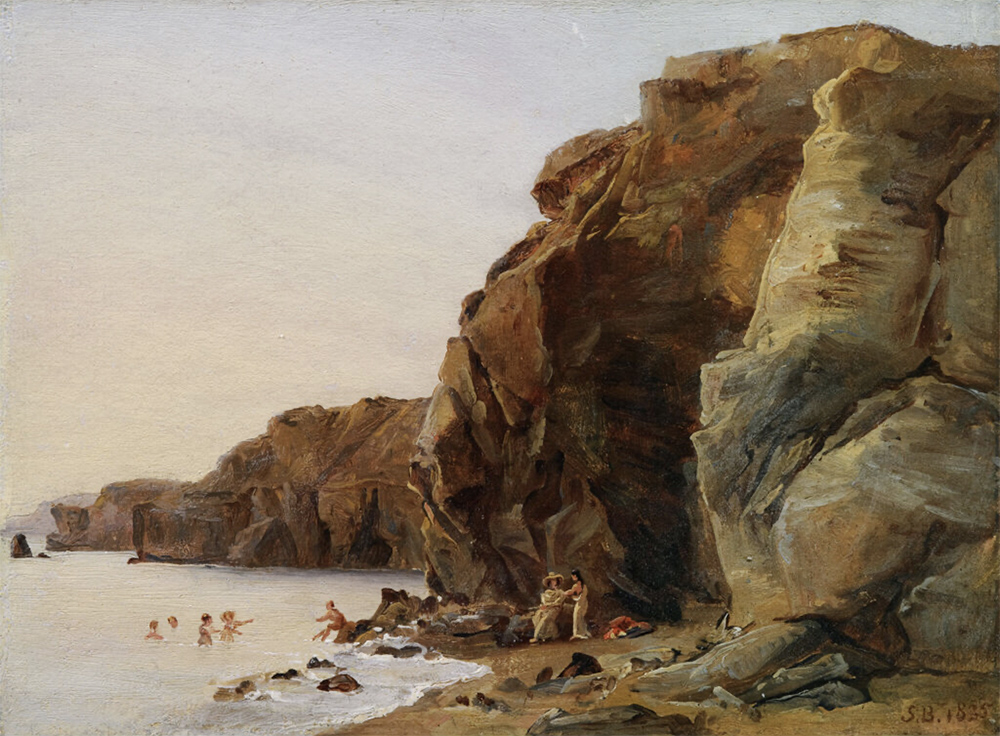 Decisamente più fresco è il piccolo dipinto – forse concepito come souvenir da regalare – che raffigura una costa rocciosa con bagnanti (in Bretagna o in Normandia), del 1835. Nella scena alcune donne si spogliano per fare il bagno mentre una donna vestita con un grande cappello, probabilmente un autoritratto della pittrice, rimane a riva a disegnare.