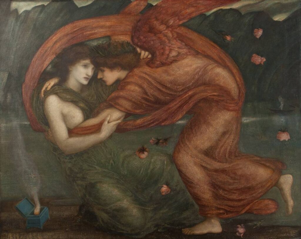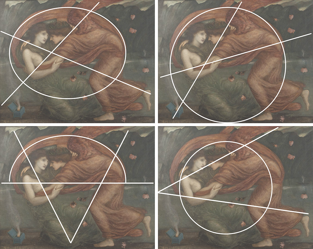 Ma vediamo come fare con un’opera più recente, di cui non è disponibile uno schema di lettura consolidato. Prendiamo questo dipinto con Amore e Psiche di Edward Burne-Jones del 1867 e vediamo se si riesce a rintracciare uno schema geometrico.