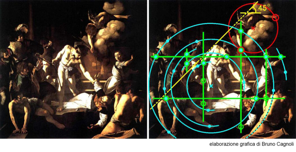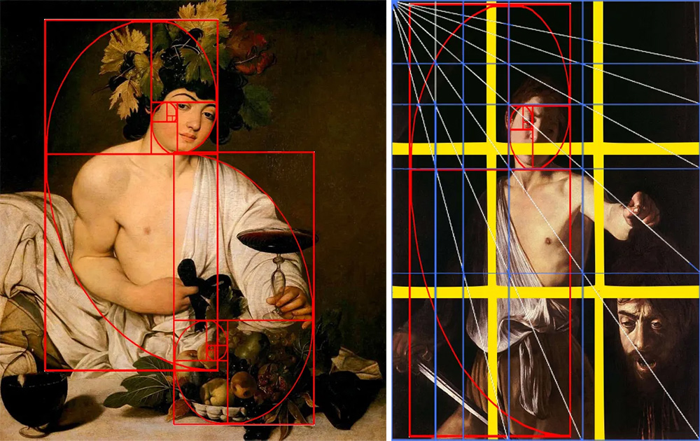 Oggi purtroppo spopolano sul web tante letture geometriche non solo azzardate ma palesemente errate. Prendiamo queste su due tele di Caravaggio. Pur di appioppare all’opera del povero Merisi un paio di spirali auree da far coincidere con qualche linea del dipinto, l’ignoto autore di questi schemi è arrivato persino a schiacciare le spirali trasformando i quarti di circonferenza in curve ellittiche!