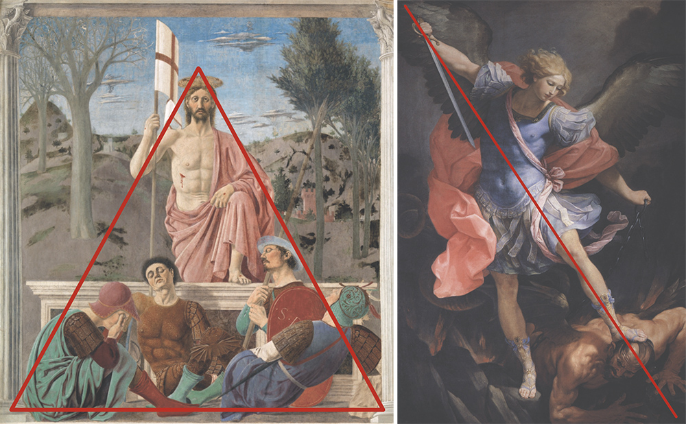 Allo stesso tempo è utile fare riferimento agli schemi tipici dell’epoca: nel Quattrocento ci aspettiamo di trovare strutture triangolari, assi di simmetria, divisioni in rapporto aureo, mentre nel Seicento è più facile che ci siano tracciati diagonali e asimmetrie, come possiamo osservare nella Resurrezione di Piero della Francesca e nel San Michele Arcangelo di Guido Reni. Ordine, equilibrio e staticità, contro fastosità, instabilità e dinamismo.