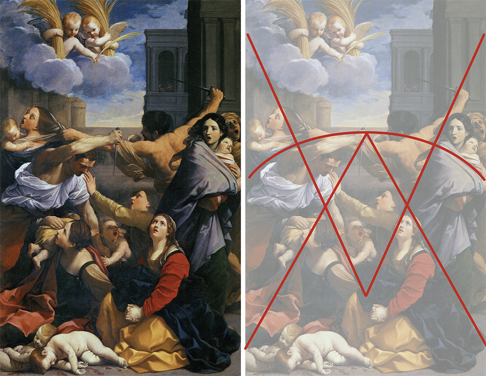 Per iniziare, occorre osservare la composizione: se c’è una geometria “forte” questa salta subito all’occhio. Nella Strage degli innocenti di Guido Reni, per esempio, c’è un’evidente andamento a V che crea un vuoto al centro. Un po’ meno visibile è una seconda V capovolta suggerita dalle due figure alla base. Infine, il braccio dell’aguzzino a sinistra e quello della donna che fugge verso destra, formano una lunga curva, ma questa è ancora più vaga.