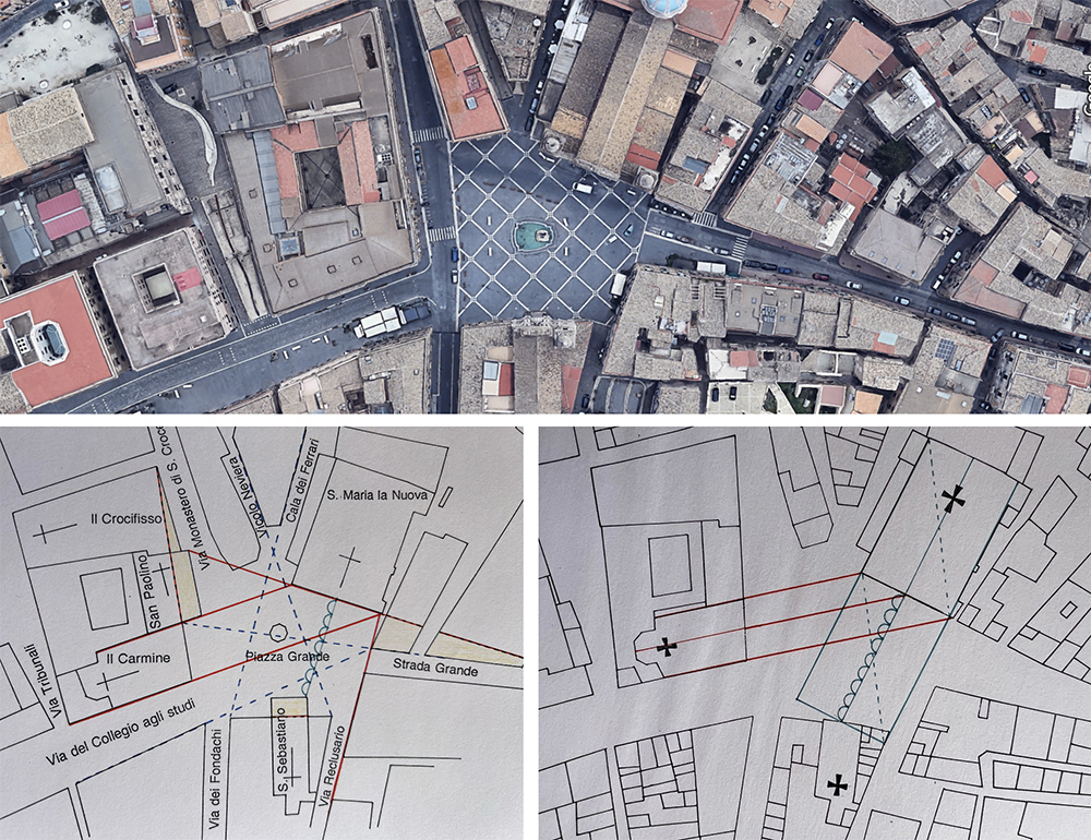 La tentazione di trovare ordine e geometria anche dove non c’è, a volte può far commettere gravi errori concettuali. Ricordo che all’università c’era una docente che chiedeva di tracciare lo schema regolatore della piazza principale della propria città di provenienza. E tuttavia in Sicilia, a parte rarissimi casi come quello della città esagonale di Grammichele, la maggior parte delle piazze è nata da una modellazione spontanea e irregolare dello spazio, stratificata nei secoli.