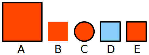 - La forma E, in cosa si distingue da TUTTE le altre? E’ un quadrato, piccolo, rosso col contorno ma non è l’UNICA ad avere ciascuna di queste caratteristiche.