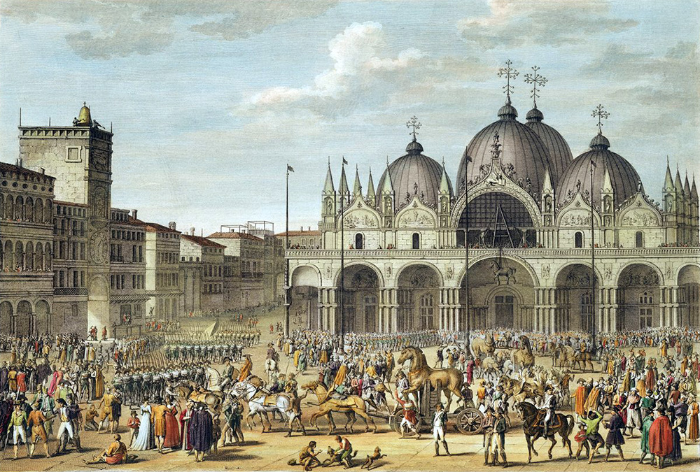 La storia però fa strani giri e a volte chiude il cerchio: dunque, così come la caduta della Repubblica di Venezia fu segnata dalla sottrazione dei cavalli, anche alla disfatta di Napoleone, nel 1815, corrisponderà la perdita delle preziose scultore bronzee.
