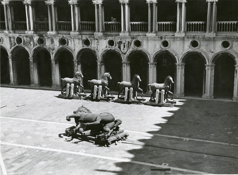 Il cavallo della statua equestre di Bartolomeo Colleoni del Verrocchio e i quattro cavalli di San Marco in attesa di essere rimessi al loro posto dopo la Seconda Guerra Mondiale, foto del 1945