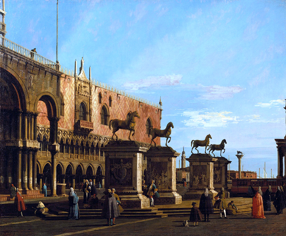 In un capriccio di Canaletto (1697-1768) del 1743 i cavalli appaiono invece su piedistalli individuali in piazzetta San Marco. Si tratta di una scena immaginaria che tuttavia rispondeva alla frustrazione di tanti artisti impossibilitati ad osservare bene i cavalli nella loro collocazione sulla loggia.