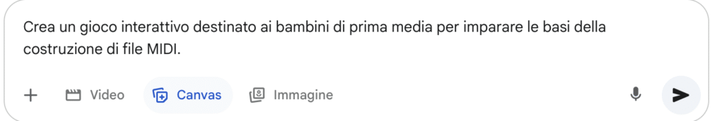 Per realizzarlo, ho chiesto aiuto a Midifriend (la mia GEM sviluppata nell’ambito del progetto Google AI Edu Fellow), formulando questa richiesta e scegliendo Canvas: