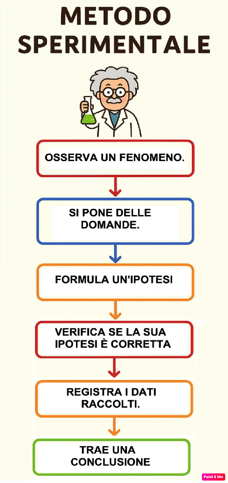 Lo scienziato, nello studio dei fenomeni, procede seguendo un modo di lavoro ben definito e preciso che si chiama metodo sperimentale. Questo metodo può svolgersi in sei tappe. Lo scienziato: