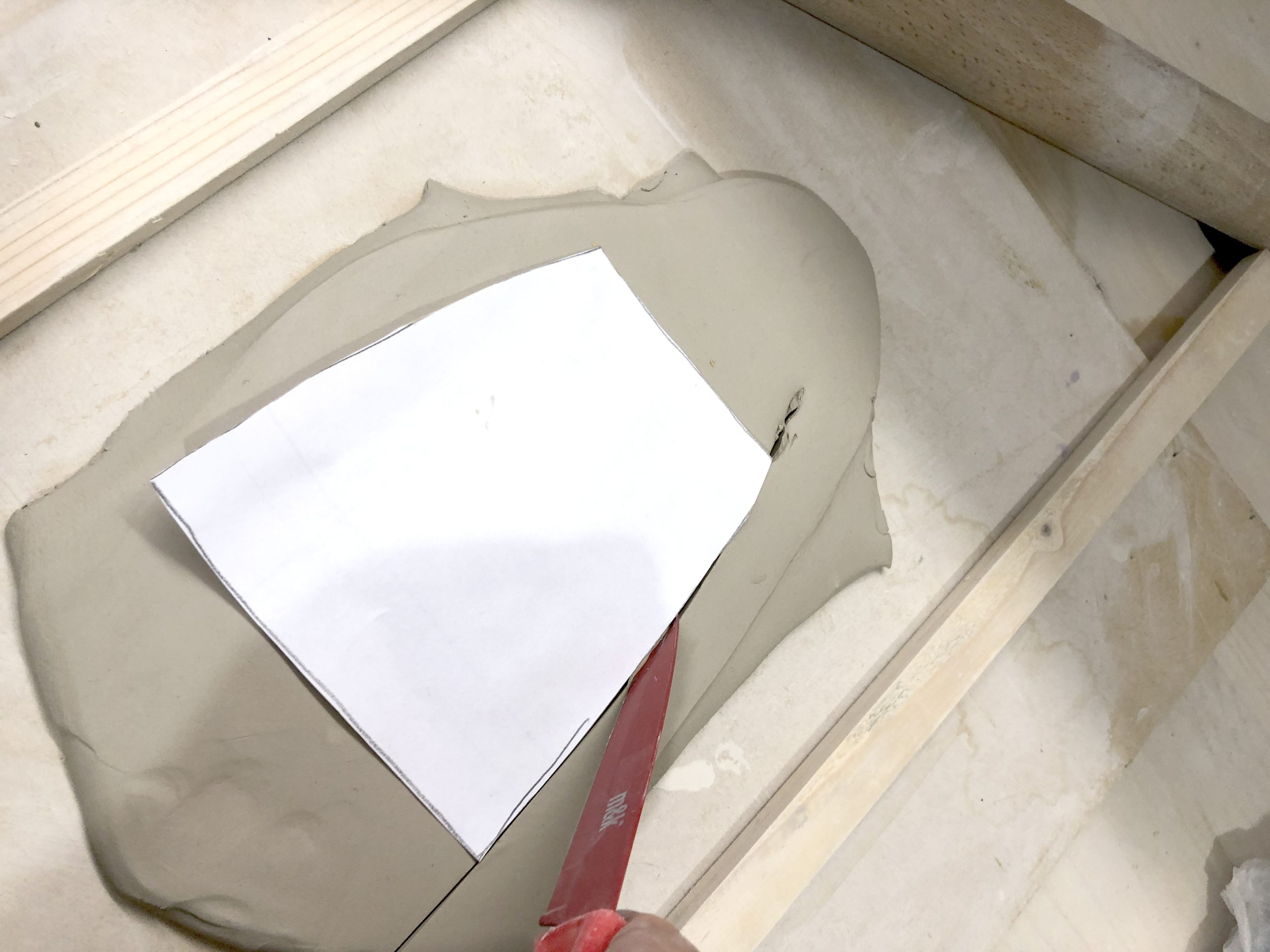 Dopo aver spianato la lastra con le guide di 0,7 cm e un mattarello, utilizziamo le sagome in cartoncino per ritagliare le pareti, la base e gli spioventi del tetto.