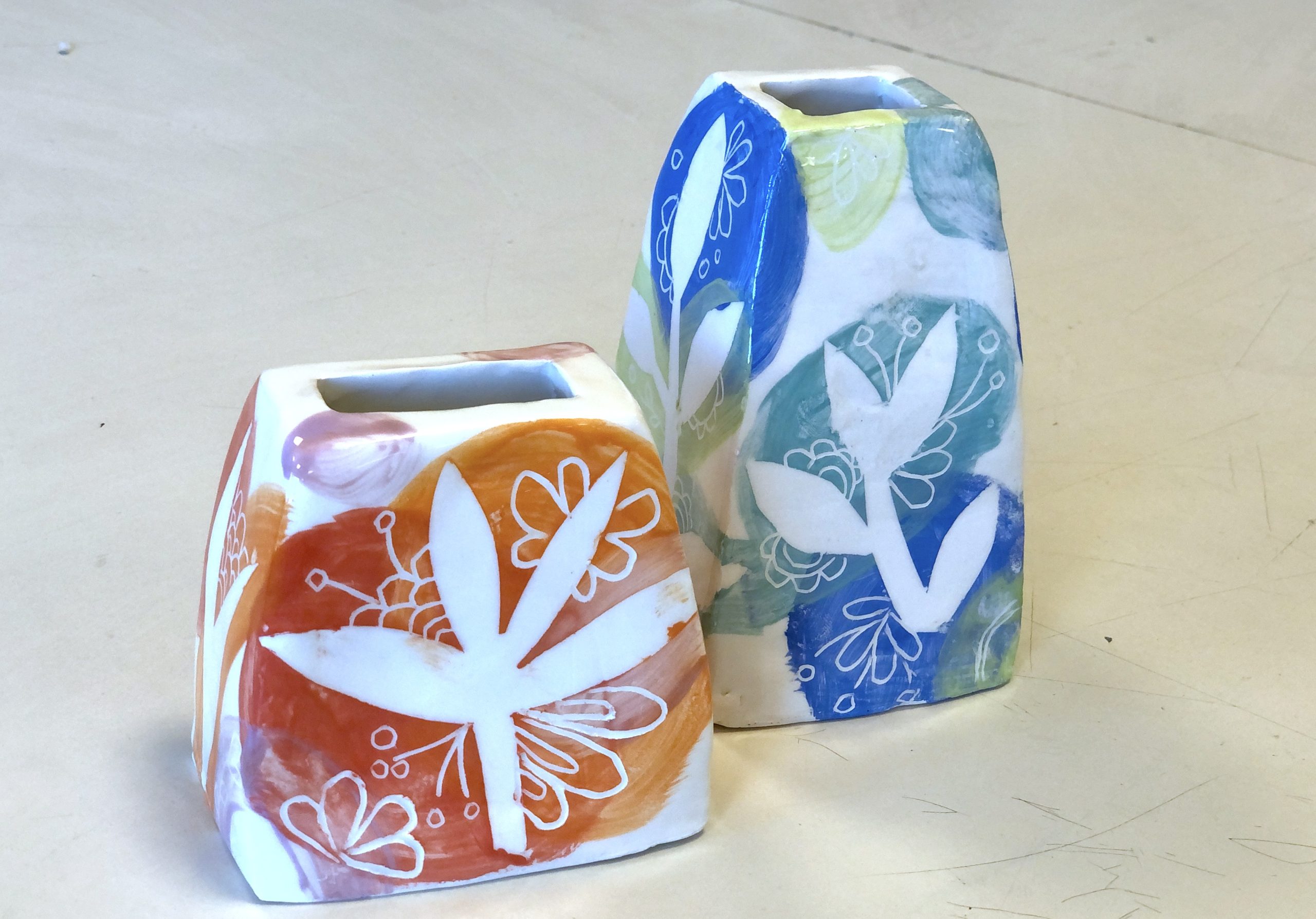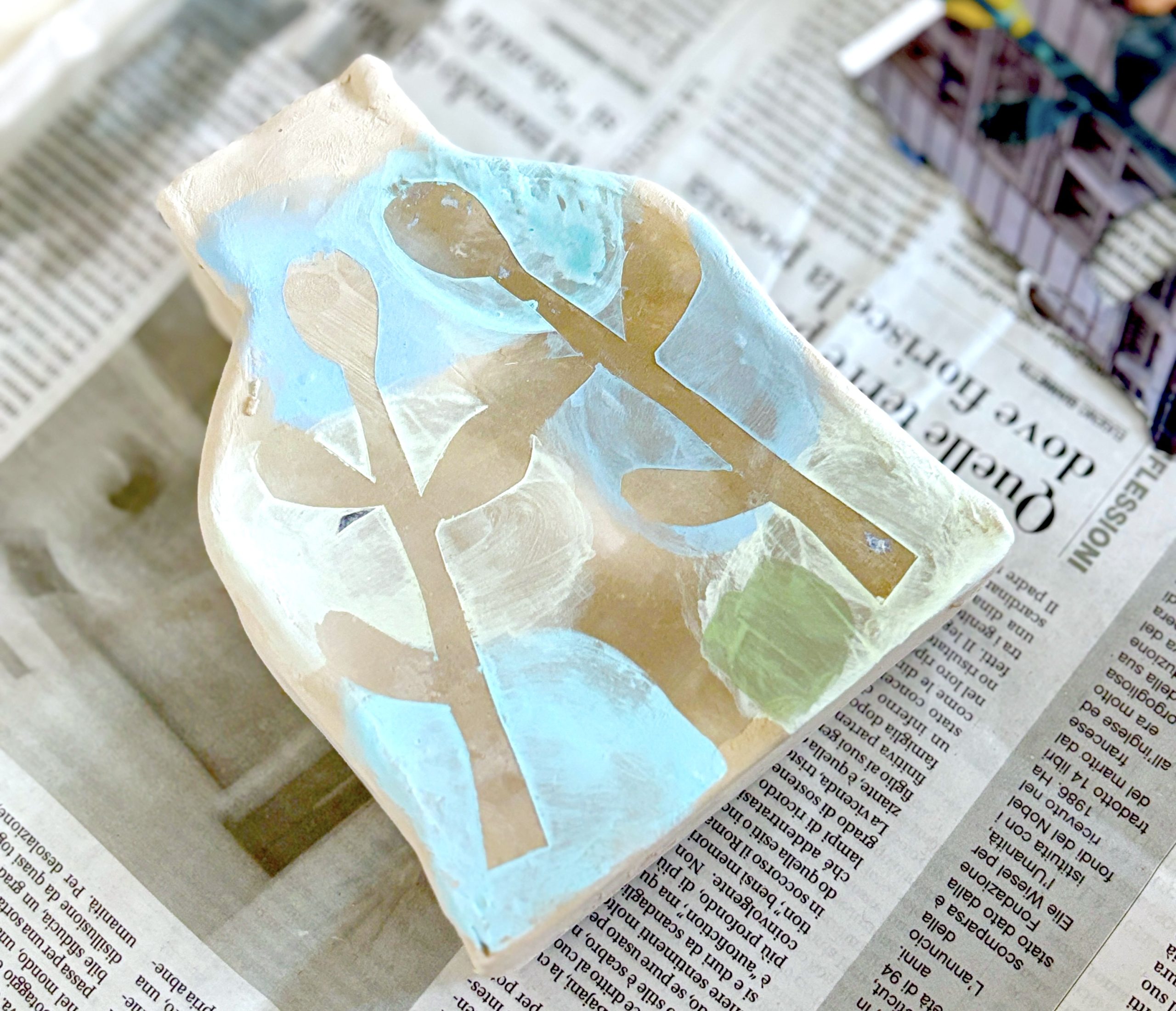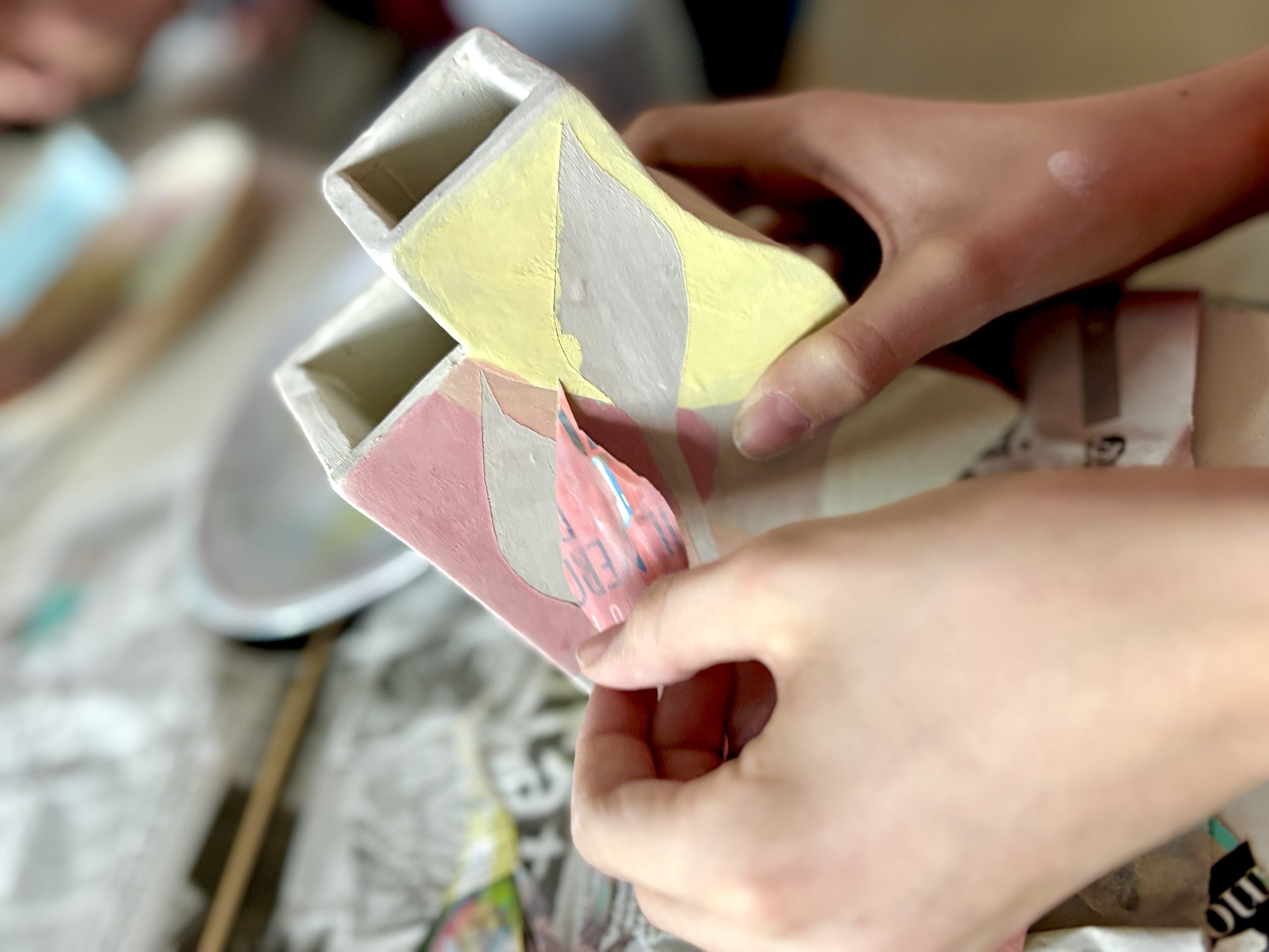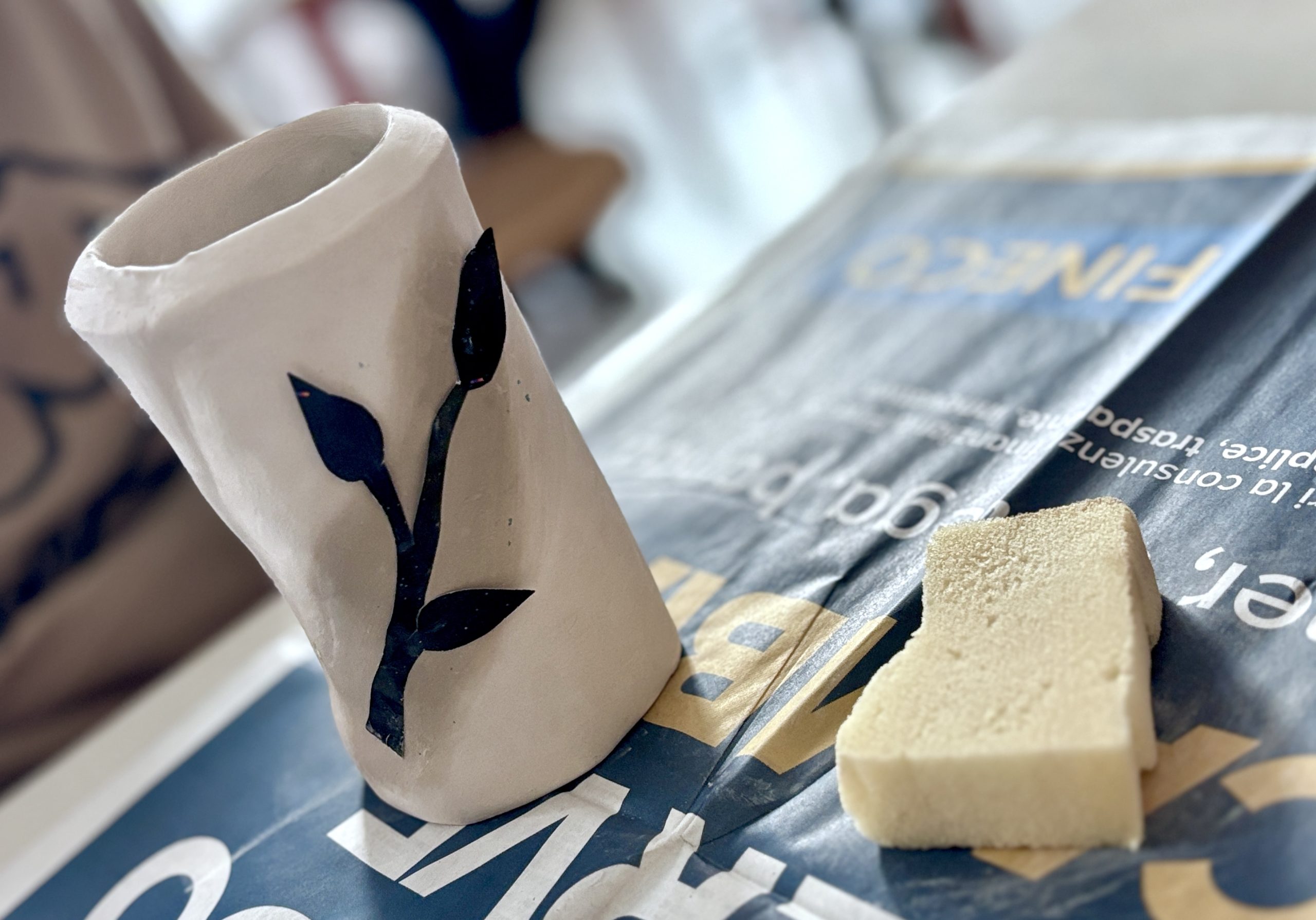 Per lo stencil, gli studenti hanno ritagliato delle forme semplici da fogli di riviste e le hanno applicate sulle superfici dei vasi con un po’ d’acqua. Sopra queste sagome è stato poi steso il colore con l’ingobbio. Una volta asciugato, la carta è stata rimossa, lasciando la forma bianca in negativo.