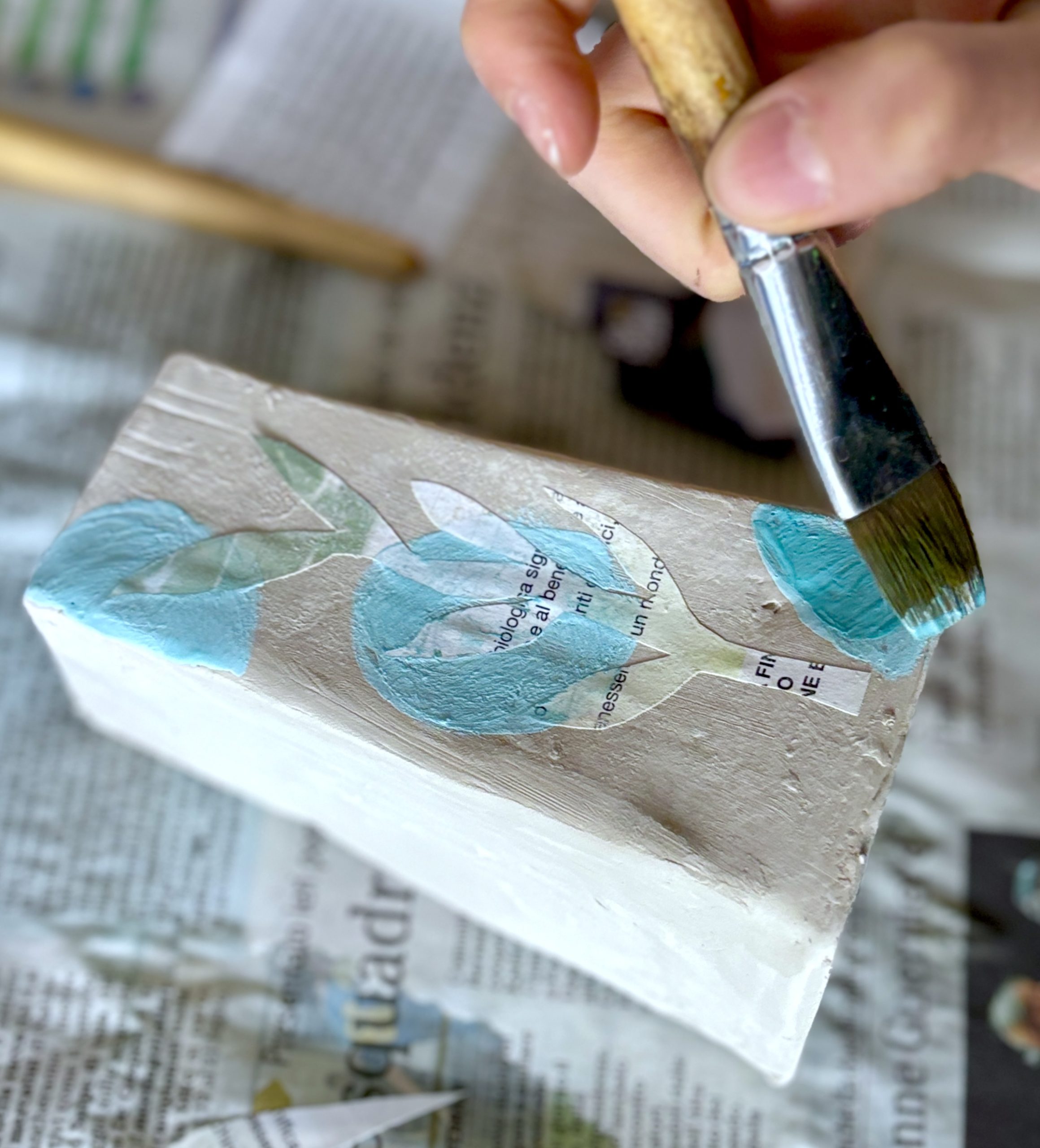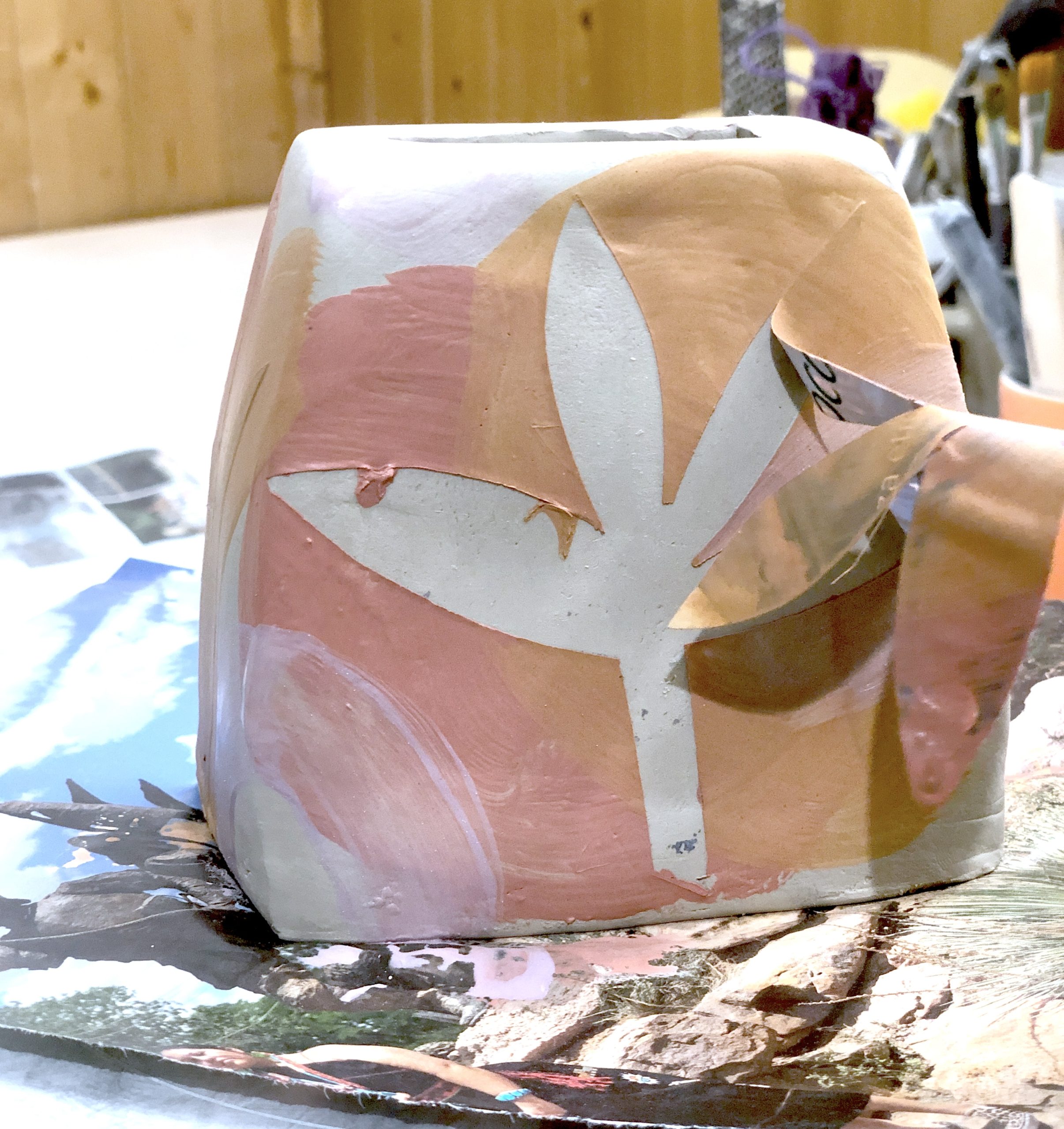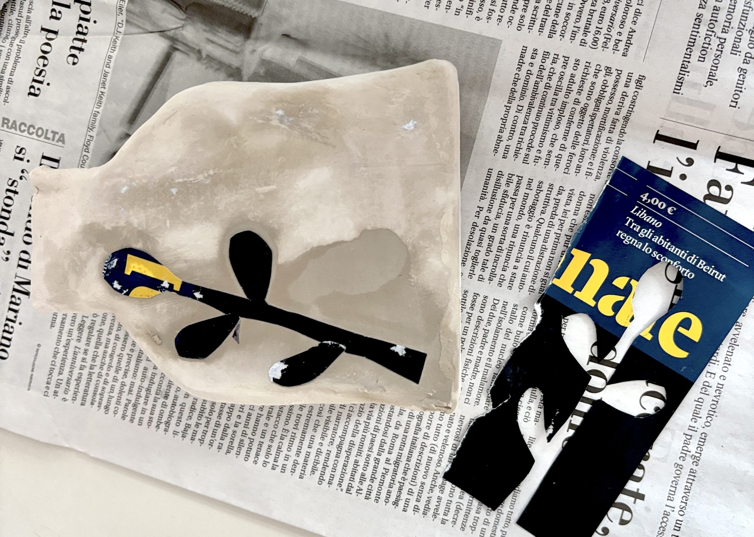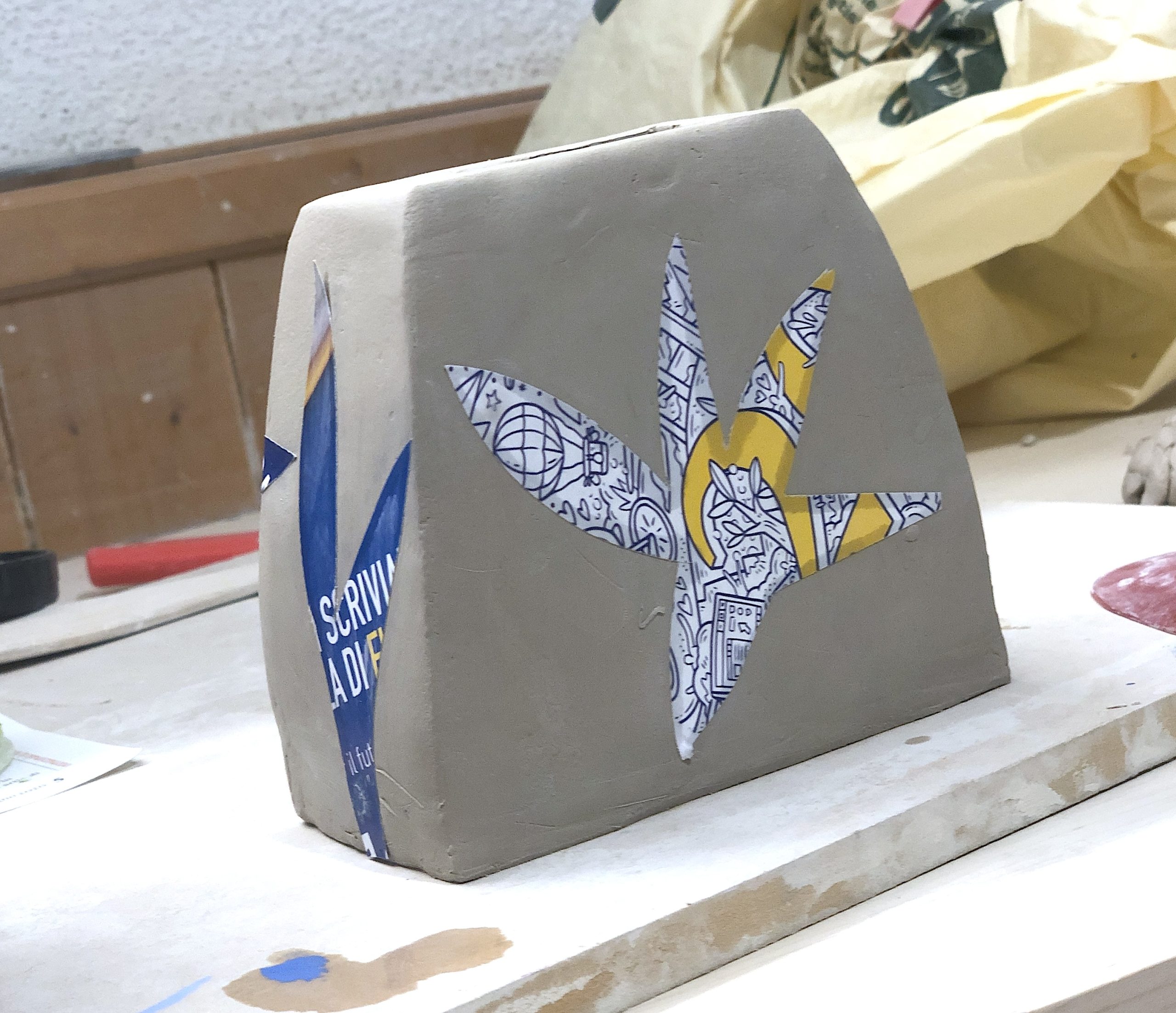 Per lo stencil, gli studenti hanno ritagliato delle forme semplici da fogli di riviste e le hanno applicate sulle superfici dei vasi con un po’ d’acqua. Sopra queste sagome è stato poi steso il colore con l’ingobbio. Una volta asciugato, la carta è stata rimossa, lasciando la forma bianca in negativo.