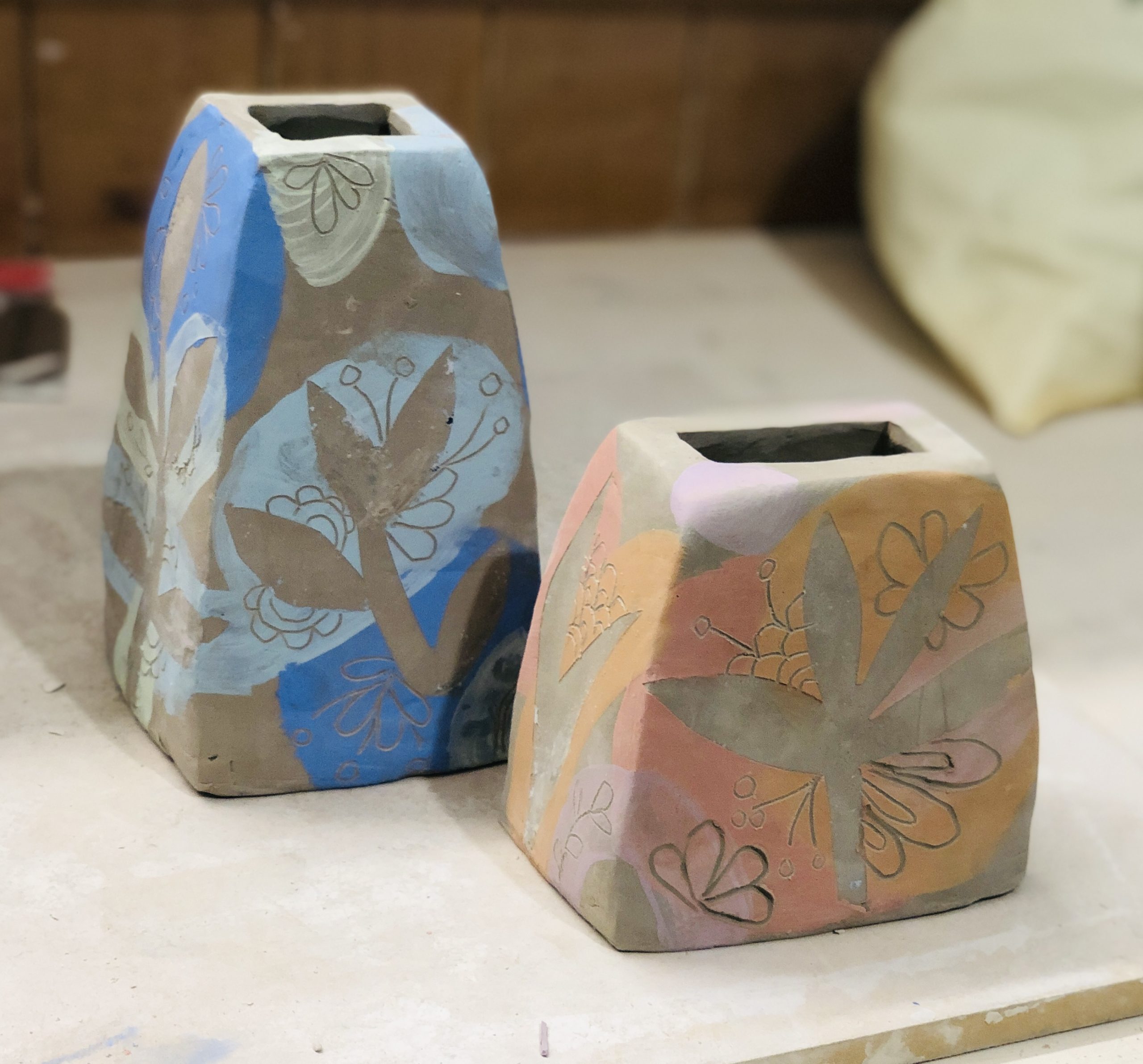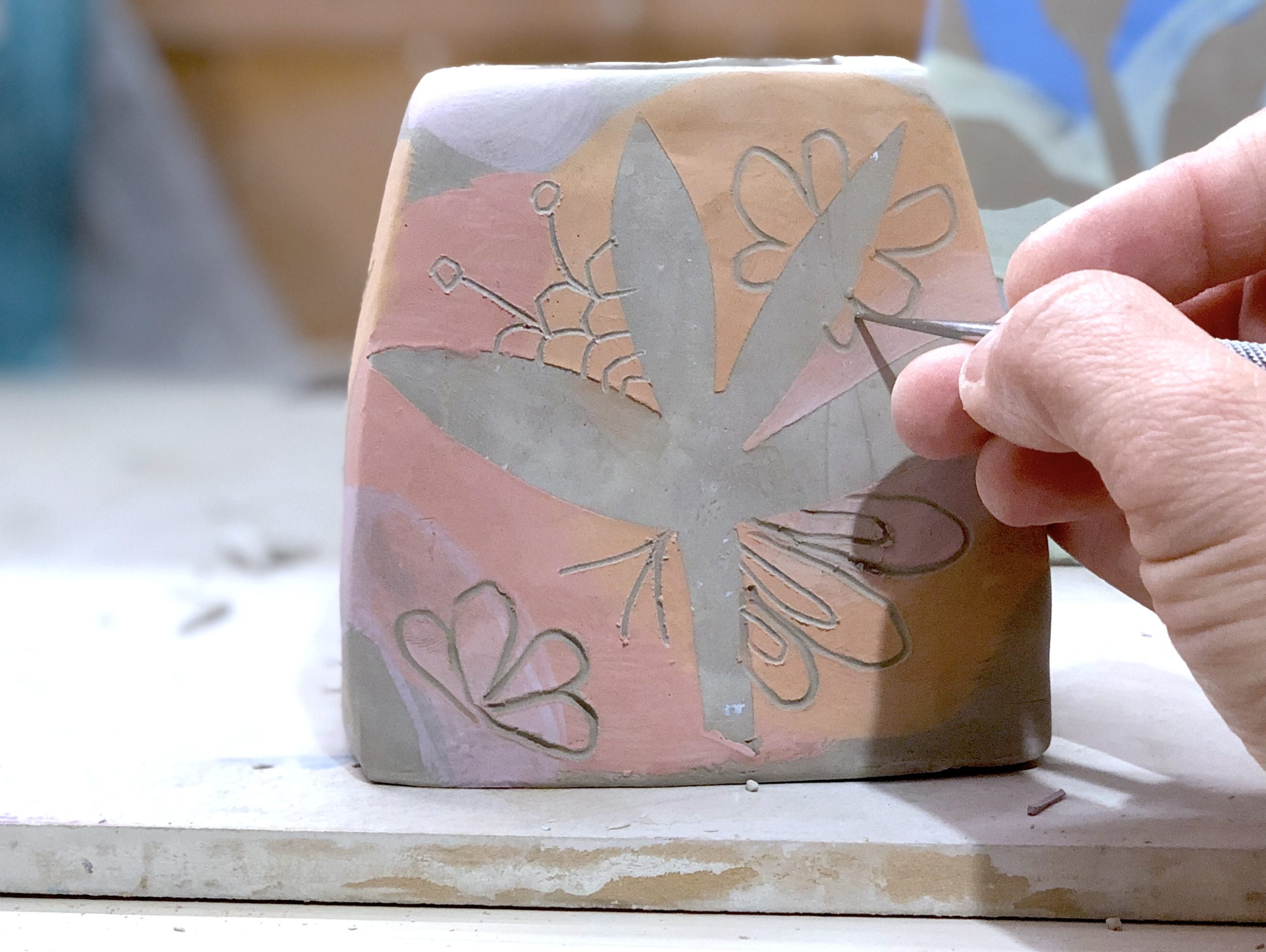 Successivamente, sui pezzi ancora a durezza cuoio, è stata applicata la tecnica del graffito: con piccoli strumenti si sono incise linee e decorazioni sulle parti colorate, aggiungendo così ulteriori dettagli e texture. Alcuni studenti hanno completato il loro vaso con interventi a pennello, per personalizzare ulteriormente la decorazione.