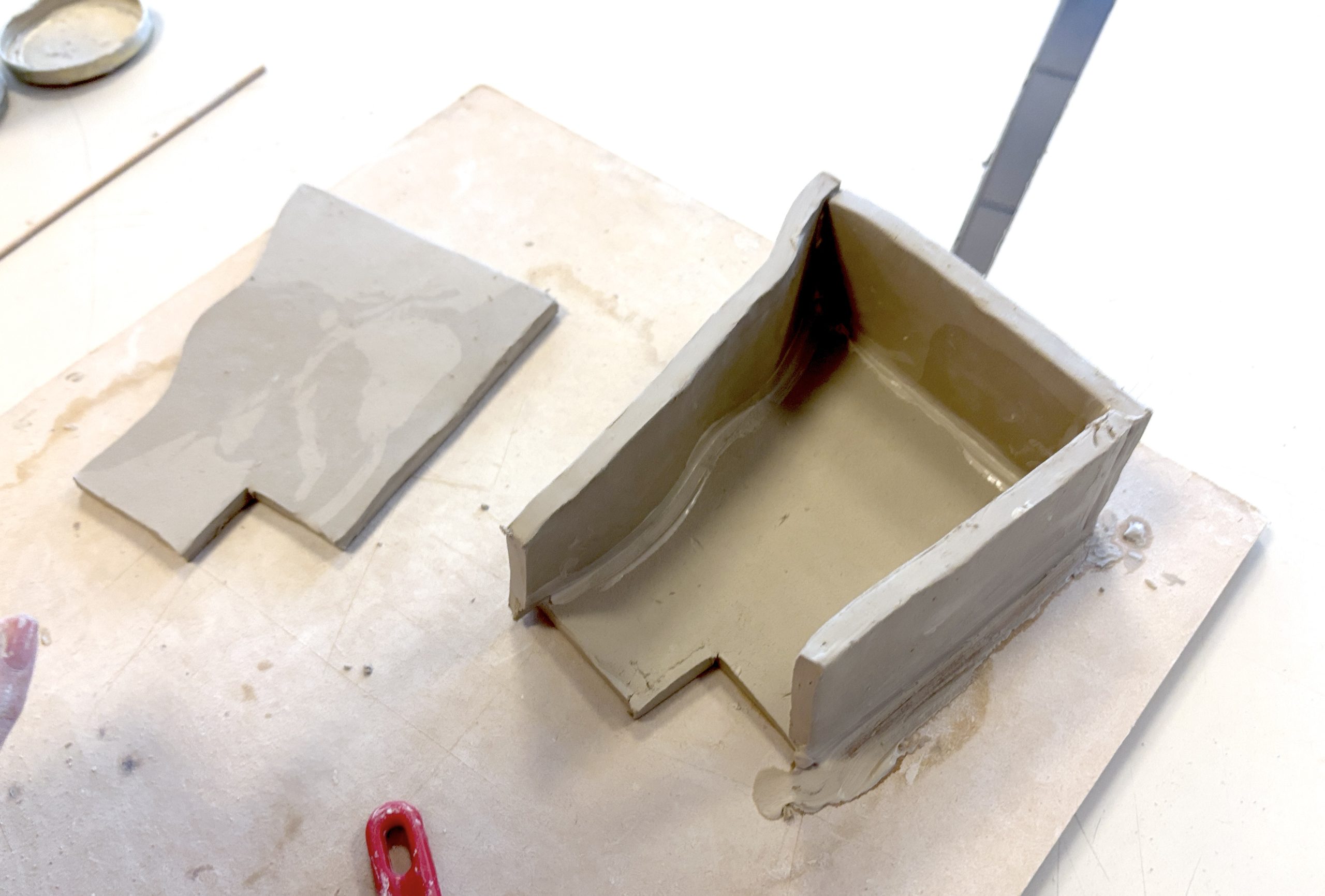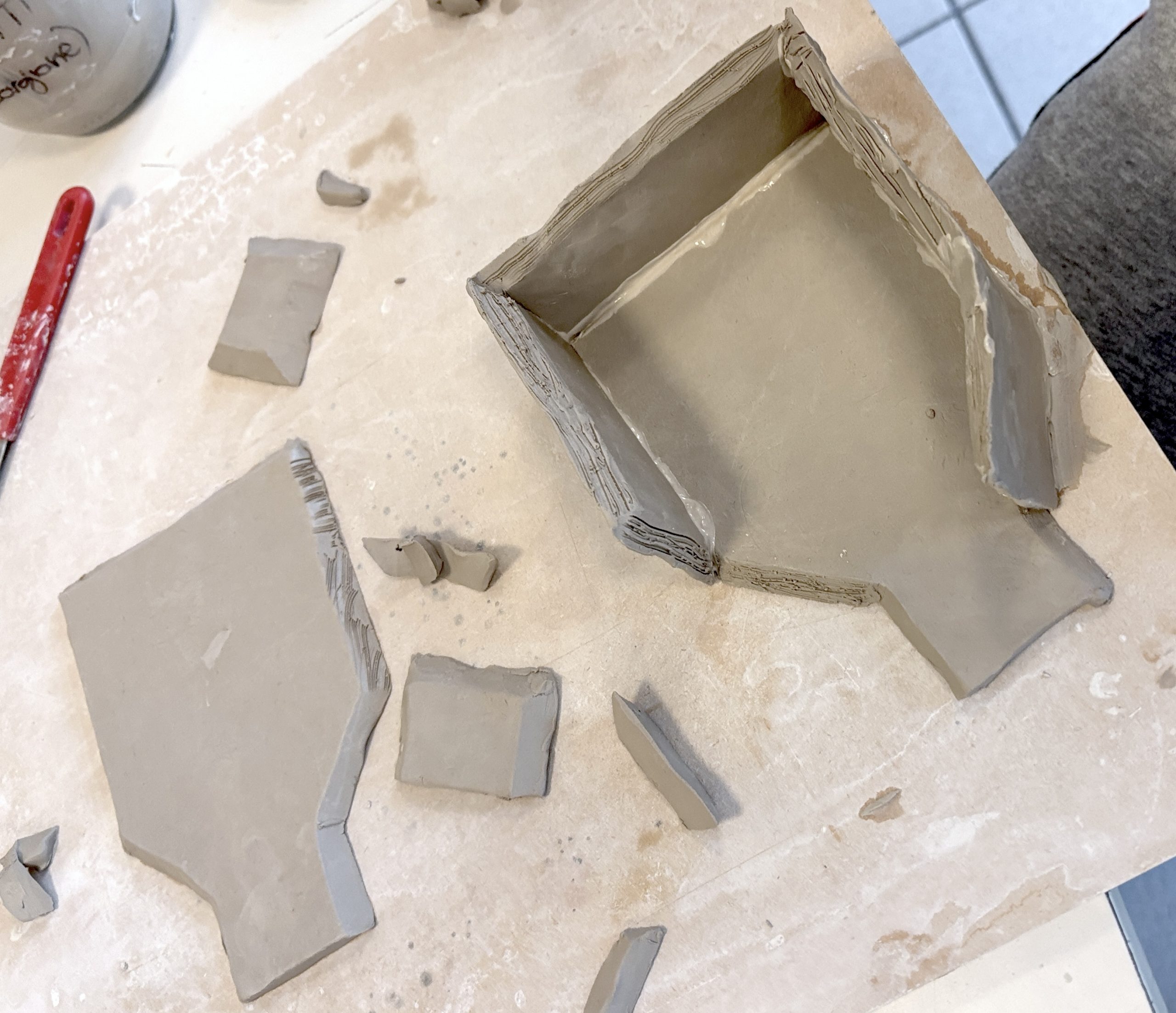 Prima dell’assemblaggio ricordiamoci sempre di zigrinare tutte le superfici che vanno “incollate” e di mettere abbondante barbottina, la creta liquida che serve da collante tra le parti.