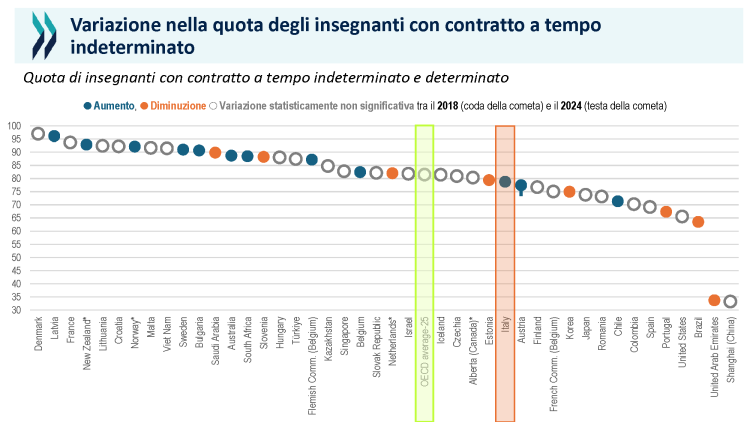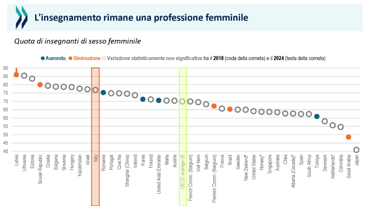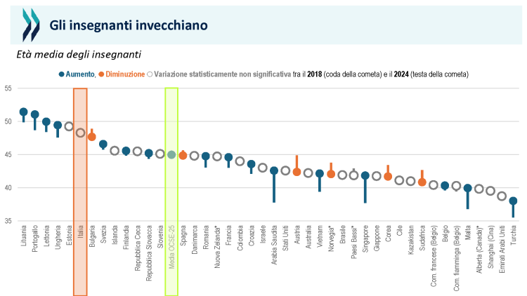 Dal punto di vista della struttura della professione ritroviamo la femminilizzazione e in maniera più accentuata l’età piuttosto alta, come si poteva prevedere, che passa dalla media OCSE di 45 ai 50 anni. In Italia ci sono anche più contratti a tempo determinato anche se, secondo la rilevazione, stanno diminuendo. Un dato per certi versi inaspettato è che gli insegnanti di seconda carriera sono più numerosi di quanto rilevato nella media OCSE.