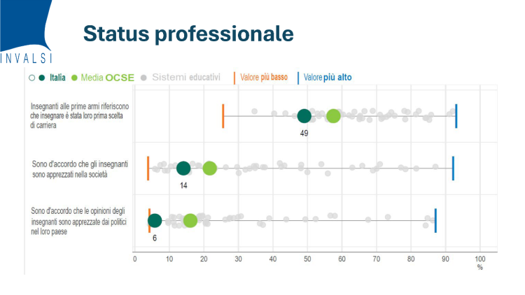 A fronte di ciò si deve registrare la percezione di un senso di scarsa stima da parte della società che, sotto la media OCSE, registra solo 1 insegnante su 7 soddisfatto della situazione. Solo il 14% ritiene di essere correttamente apprezzato dalla società e, quanto alla valorizzazione da parte dei decisori, si scende al 6%. Dunque lo iato registrato in tutti i Paesi è in Italia particolarmente accentuato.