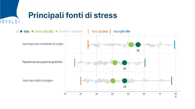 Sostanzialmente simile al quadro internazionale è invece l’individuazione delle cause principali dei maggiori livelli di stress: i problemi di disciplina e gli aspetti “amministrativi” legati alla professione, oltre che il carico dei compiti da correggere, problema da noi particolarmente sentito.