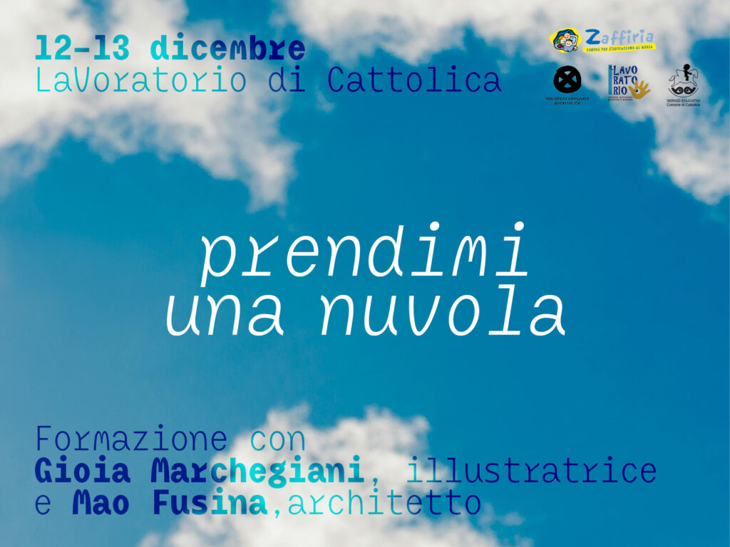 Il 12 e il 13 dicembre (dal venerdì pomeriggio al sabato pomeriggio) al LaVoratorio di Cattolica esploriamo le nuvole in tanti modi diversi in un concatenarsi di possibilità condivise tra Gioia Marchegiani (illustratrice), Mao Fusina (architetto) e Alessandra Falconi. Nuvole da disegnare, guidare, misurare…