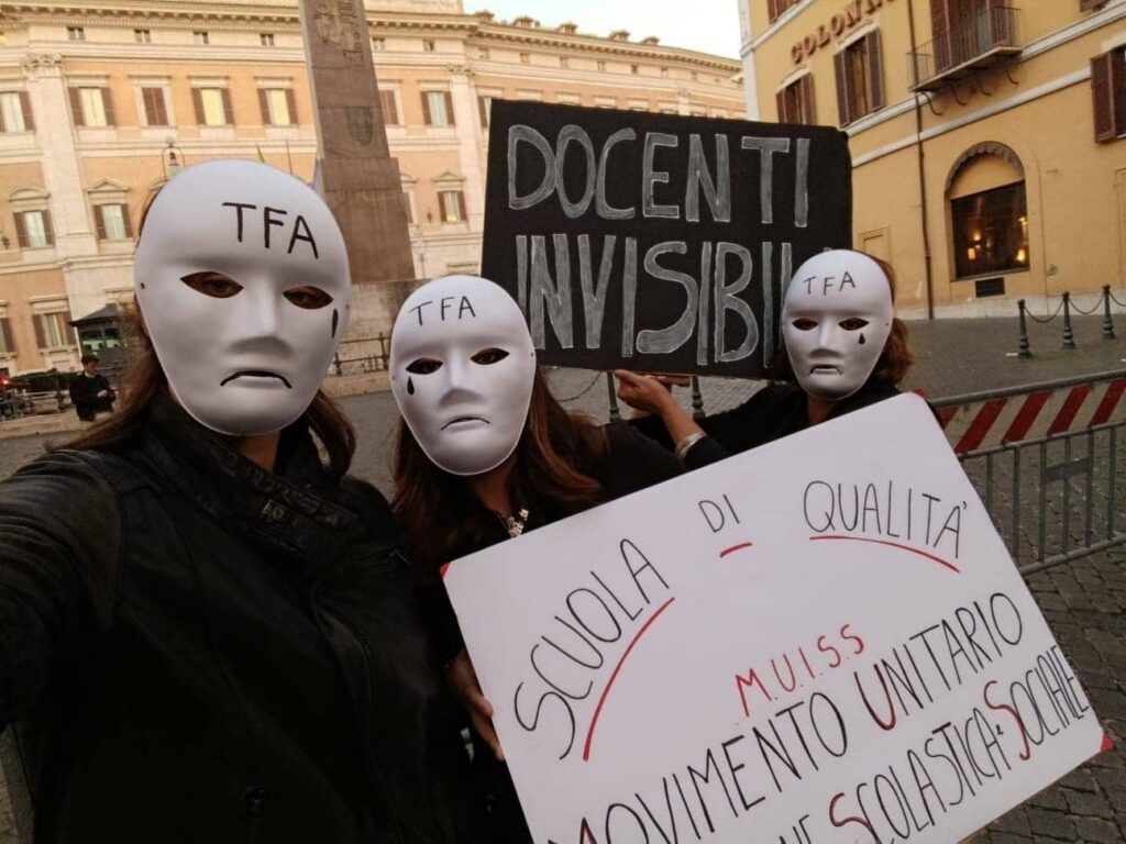 Roma, 27 ottobre 2025 – Questo pomeriggio, Piazza Montecitorio è stata teatro di una protesta simbolica organizzata dal Movimento Unitario per l’Inclusione Scolastica e Sociale (MUISS). Tre docenti, Michela, Emanuela e Roberta, hanno rappresentato il movimento indossando abiti neri e maschere bianche con la scritta “TFA”, dando vita alla figura dei “Docenti Invisibili”.