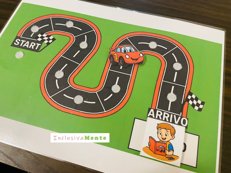 Il supporto visivo e la chiarezza grafica favoriscono la comprensione anche in assenza di linguaggio verbale, mentre la dimensione ludica (gara, macchinine, percorso) mantiene alto l’interesse e la partecipazione.
