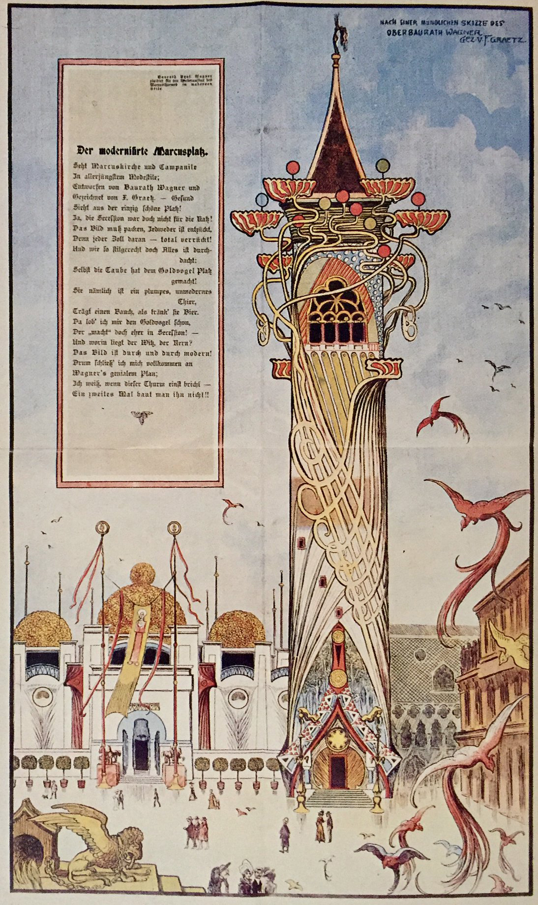 All’inizio del Novecento il campanile si presentava in grave stato di degrado ma nessuno immaginava che sarebbe crollato. Dopo il disastro le autorità promisero immediatamente la ricostruzione del campanile e della Loggetta di Sansovino. Alcuni gruppi, ampiamente minoritari, proposero di non ricostruire affatto il campanile o di farlo in forme contemporanee, dunque nel linguaggio Art Nouveau. Ma alla fine prevalse la scelta di creare un “falso storico” ricostruendo il campanile “dov’era e com’era”.