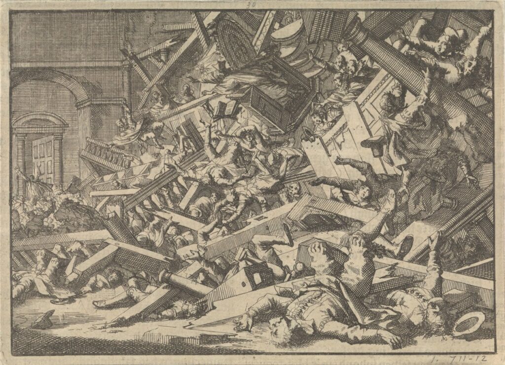 Jan Luyken, Galleria crollata durante una messa cattolica nella casa dell’ambasciatore spagnolo a Londra, 1623