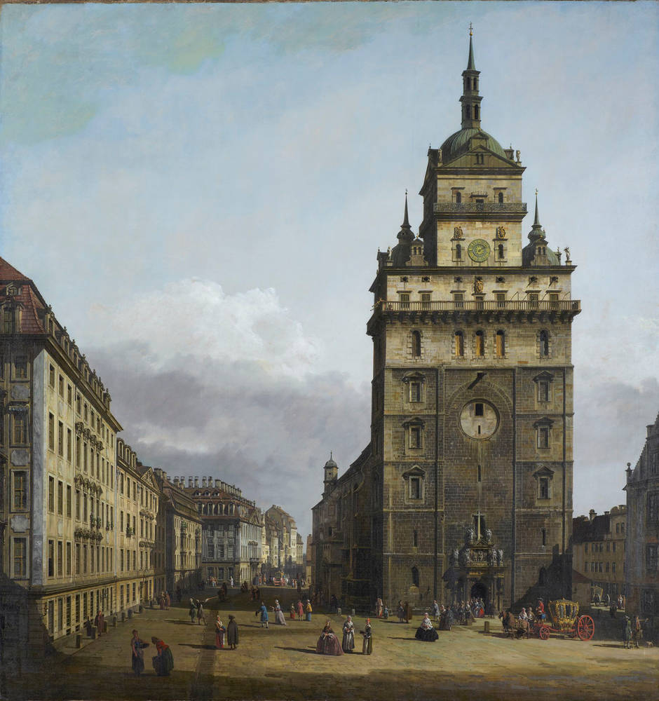 La chiesa esibiva un poderoso westwerk quattrocentesco, una facciata occidentale turrita alta ben 96 metri. Nel 1760, nel corso della Guerra dei Sette Anni, la chiesa venne bombardata dall’artiglieria prussiana e il conseguente incendio fece crollare l’edificio. La facciata però rimase in piedi, sebbene danneggiata. Ma nel giugno del 1765, mentre la ricostruzione della retrostante chiesa era già avviata, la struttura rovinò al suolo sbriciolandosi in una montagna di macerie. È così che la vide di nuovo Bellotto, nel suo secondo soggiorno a Dresda.