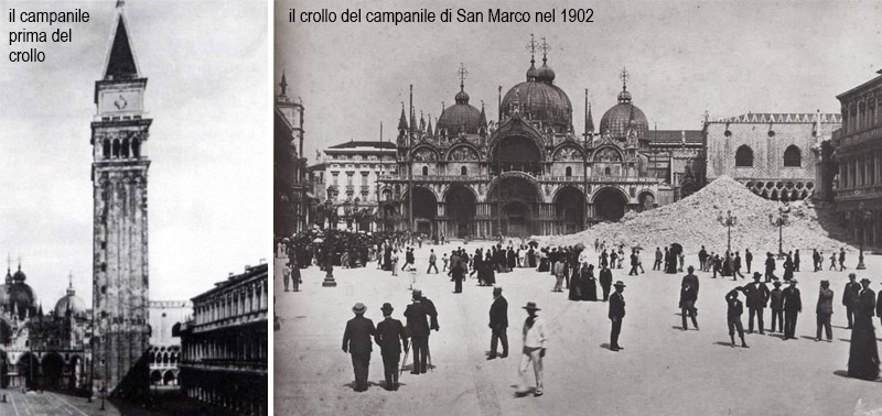 Diverso è il caso di un’altra torre, ben più famosa: il campanile di San Marco a Venezia. Era il mattino del 14 luglio 1902 quando l’antica torre campanaria si sbriciolò con un boato in un’enorme nuvola di polvere. Il vecchio “paròn de casa“, come era chiamato affettuosamente dai veneziani, era collassato a causa delle profonde lesioni che si erano aperte sul lato nord-est, quello verso la basilica.
