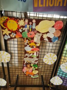 I ragazzi di classe quarta hanno realizzato una grande croce tau, simbolo di amore, umiltà e salvezza per San Francesco, decorandola con i disegni degli elementi della natura, dal sole, al fuoco, ad ogni tipo di essere vivente, tutti a rappresentare la magnificenza del Creato.