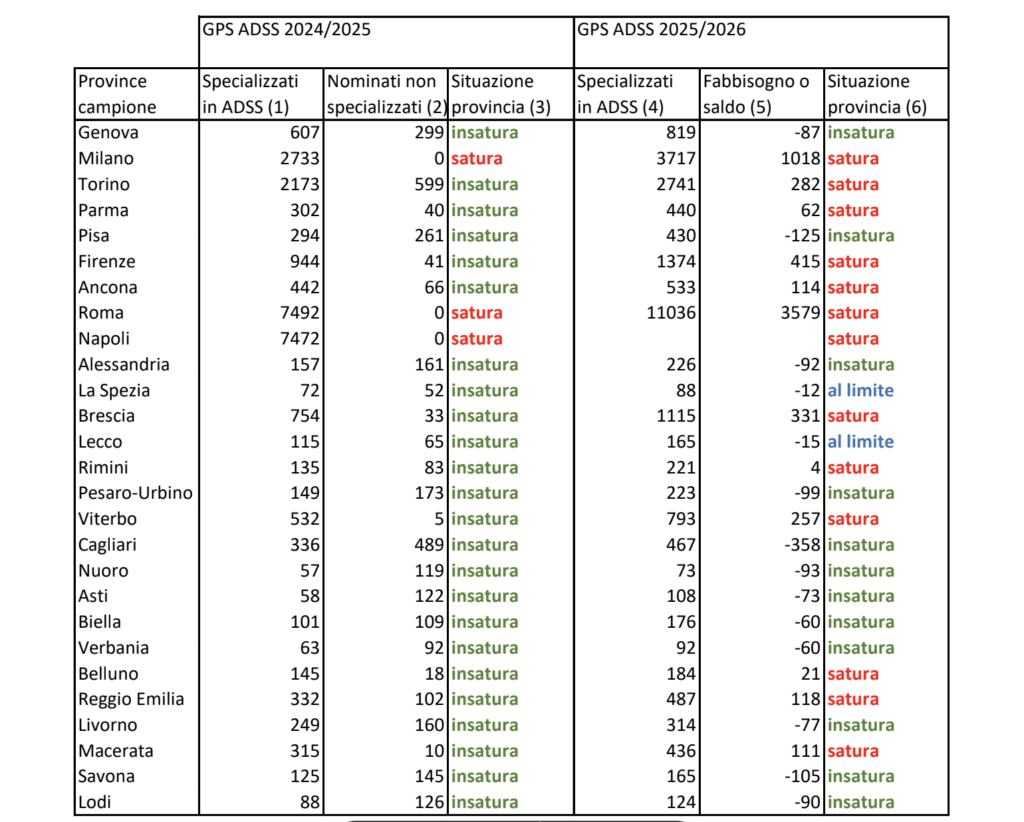 Esprimiamo forte preoccupazione per la crescente saturazione delle Graduatorie Provinciali per le Supplenze (GPS) nel settore ADSS. Già nell’anno scolastico 2024/2025 oltre 22.000 docenti specializzati non hanno ricevuto alcuna nomina, con un eccesso stimato di circa 15.000 insegnanti e 44 province in cui le graduatorie non si sono esaurite.