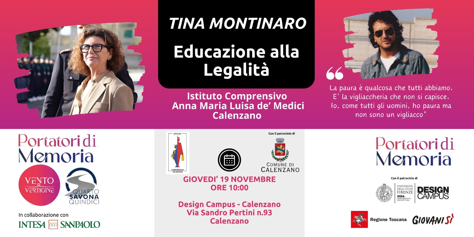 L’Istituto Comprensivo “Anna Maria Luisa de’ Medici” di Calenzano (FI) prosegue con impegno il percorso di Educazione alla Legalità. Il prossimo 19 novembre, dalle ore 10:00, presso il Design Campus di Calenzano, le alunne e gli alunni delle quinte di Scuola Primaria e delle terze di Scuola Secondaria di Primo Grado incontreranno la Sig.ra Tina Montinaro, autrice del libro “Non ci avete fatto niente”. L’evento è parte del progetto Portatori di Memoria, realizzato dalle associazioni Vento e Vertigine APS, Quarto Savona Quindici, in collaborazione con Intesa Sanpaolo e con il patrocinio della Regione Toscana – Giovani Sì.